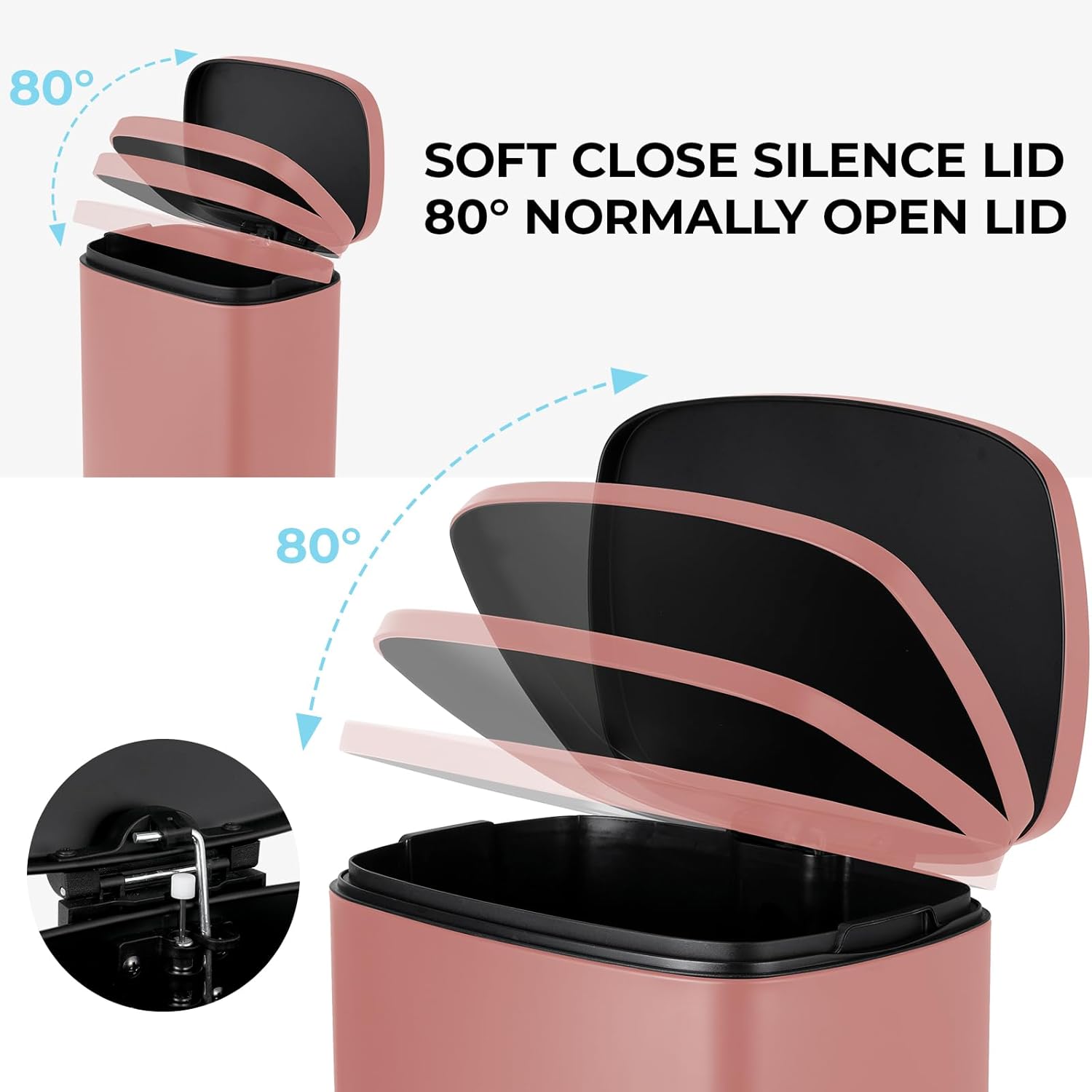 - Quiet Closing&Lid-lock: Heavy-duty garbage can is built with integrated step pedal mechanism and the force damper, which soft open and close lid while preventing slamming and banging. Lid-lock can help keep trash can open without stepping if you are inconvenient to keep stepping on pedal.