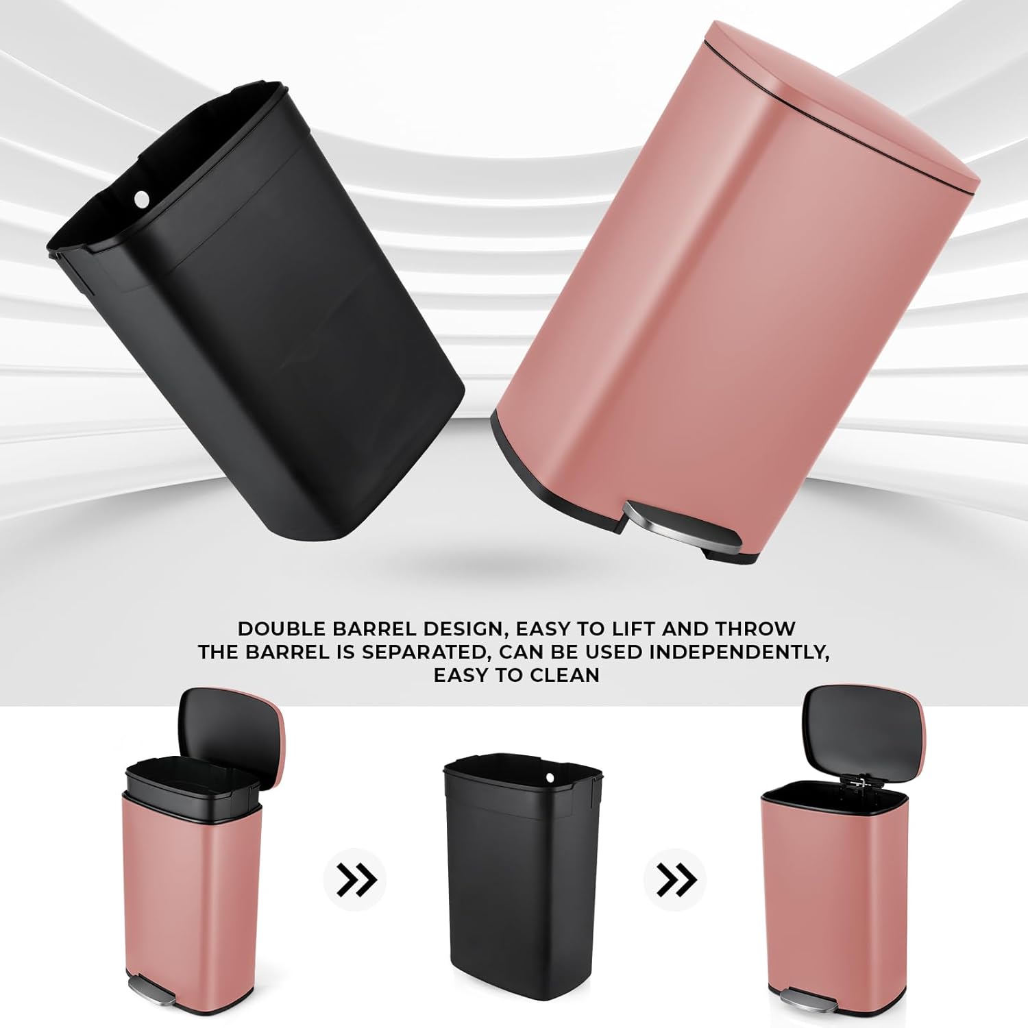 - Stainless Steel&ABS Buckets: Kitchen trash can is made of 410 stainless steel and adopts a wire drawing process. It has a delicate appearance and is easy to clean. Trash can uses detachable ABS inner barrel is convenient for garbage disposal and replacement of garbage bags.