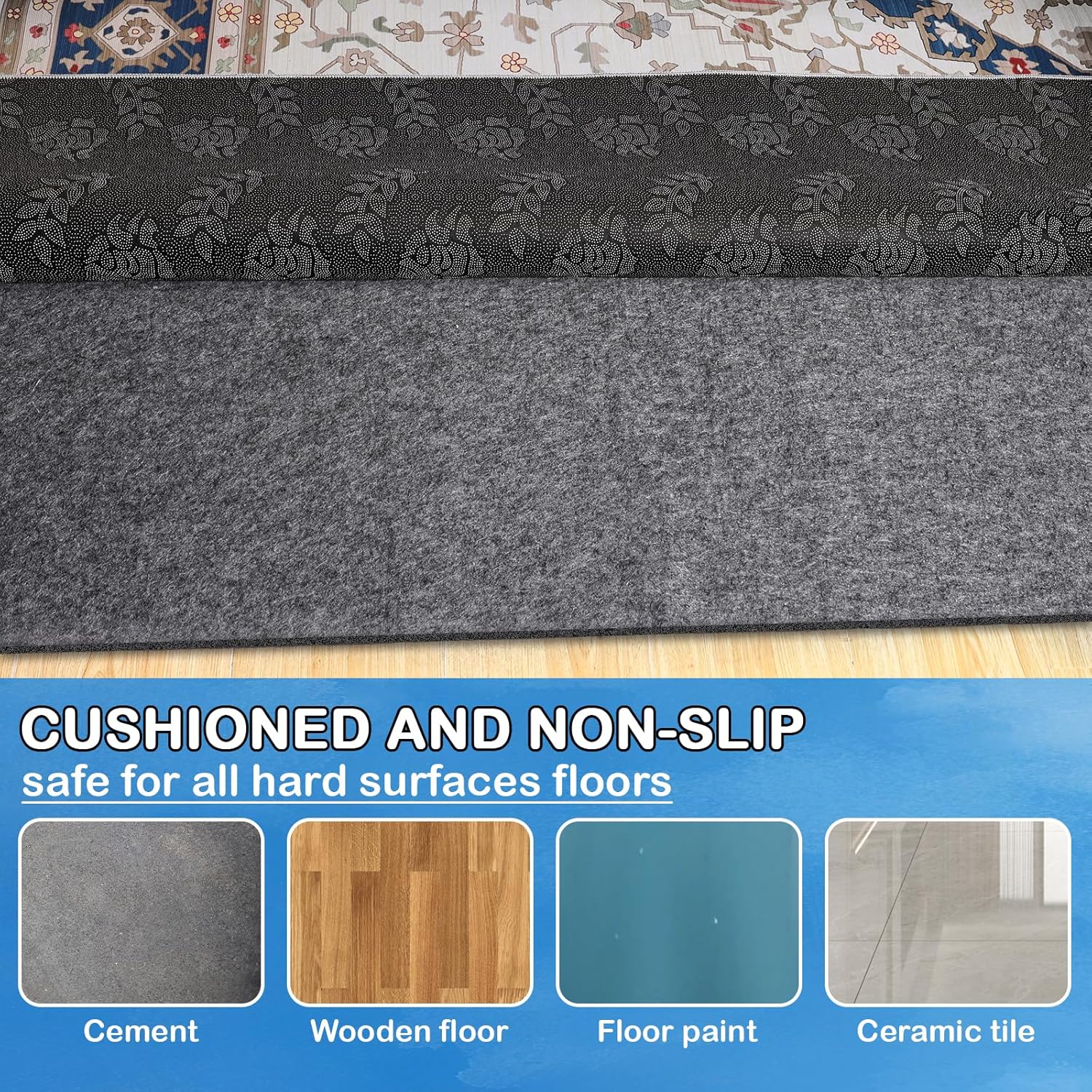 - 【Extra Larger Rug Pad】-- Only rug pad, Not included area rug . Extra larger size, perfect for living room and bedside rug. This made of felt and Waterproof TPR,1/4" thick, won't stain, damage or leave marks on your floor, durable and sturdy, Bringing comfort and convenience to your life.