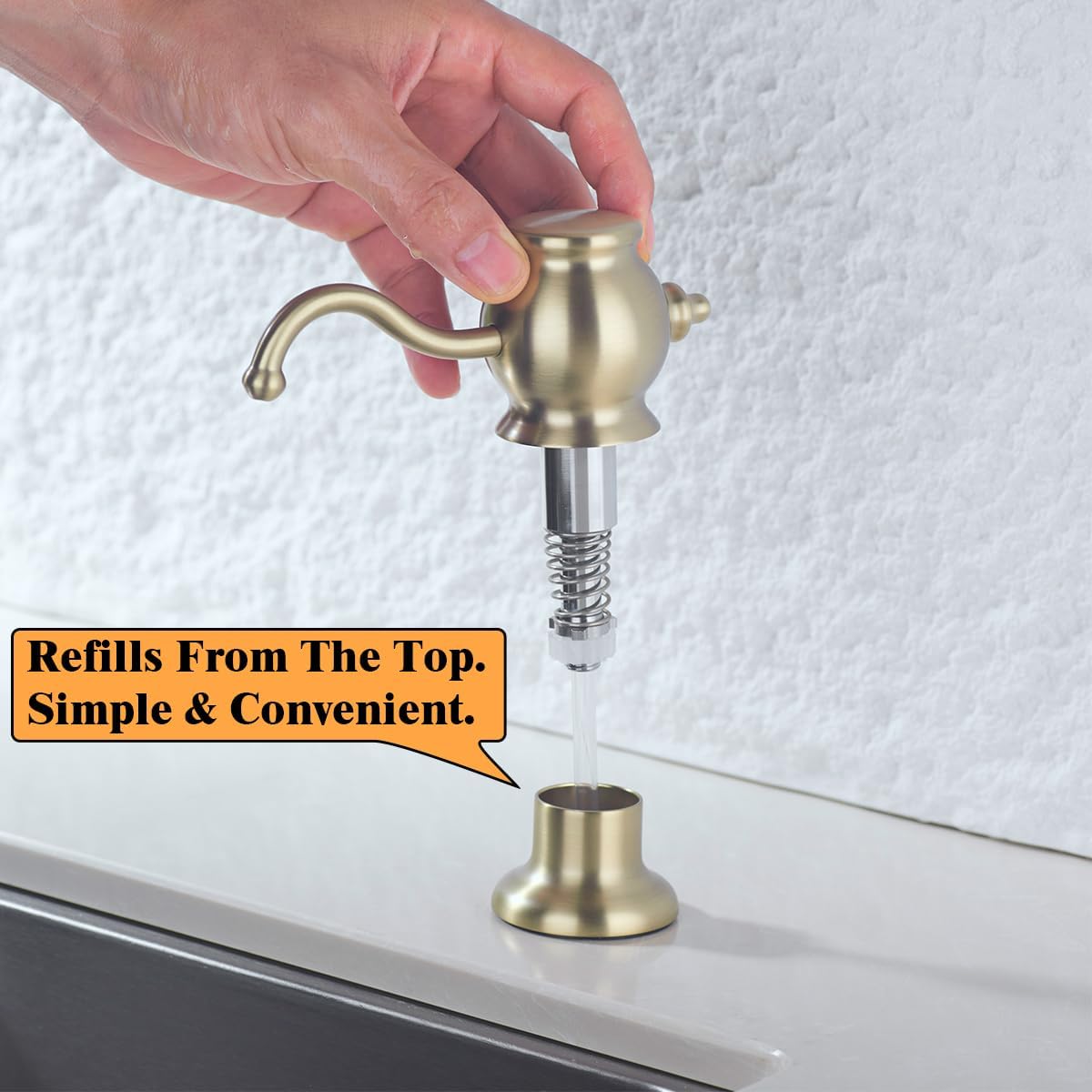 RANDOM Built in Sink Soap Dispenser for Kitchen Sink,Brushed Gold Solid Brass Pump Head with Soap Dispenser Extension Tube Kit and 11 Ounce Large PET Liquid Soap Bottle.RD84038BG