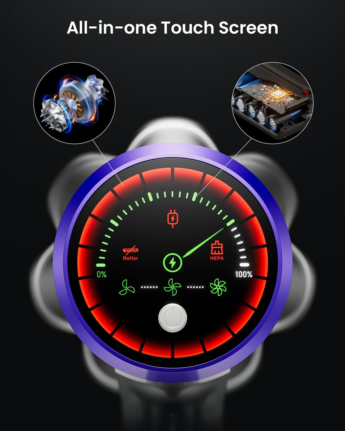 - 【Button Start and Touch Control】 The vacuum cleaner's power switch is located on the touchscreen. Press it once to start instantly. (After fully charged, unplug the charging cable and make sure the battery is installed on the vacuum cleaner) No need to worry about accidentally closing it. There are three suction icons on the touchscreen; simply touch any icon to select between threee modes. Just one touch, no waiting.