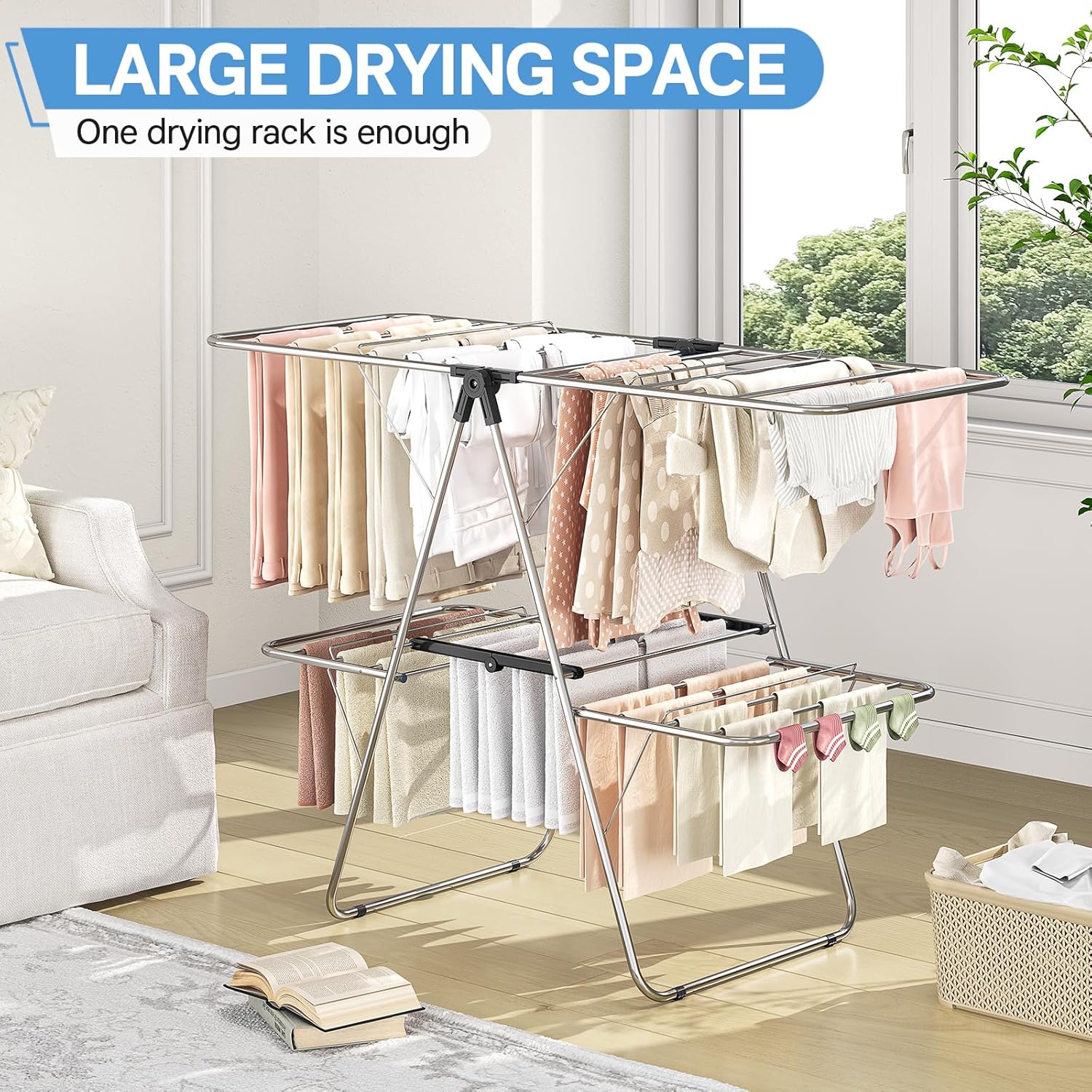 - Large Drying Space: Our drying rack is divided into two layers and four wings. The upper layer is 56.5 inches wide, making it easy to dry large bedding. The lower layer is designed to hang smaller items such as socks and towels, providing a spacious drying space for the whole family!