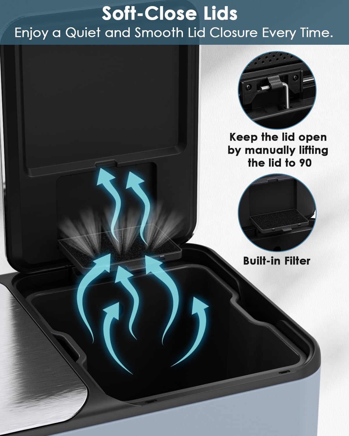- Built-in Box for Odor Control: Dual trash combo is perfect for the kitchen. Both lids are equipped with built-in box for storaging cleaning material for helping to improve the air quality around the trash can. Enjoy a clean and pleasant environment.