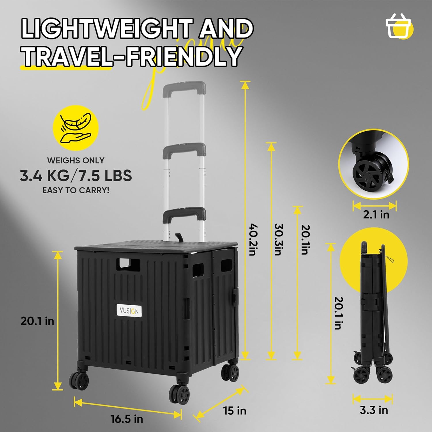 VUSIGN Folding Utility Cart, Foldable Rolling Crate Handcart with Lid, Portable Collapsible Shopping Trolley Tool Box, 4 Rotate Wheels for Grocery, Office, Travel, Teacher, Luggage, Black
