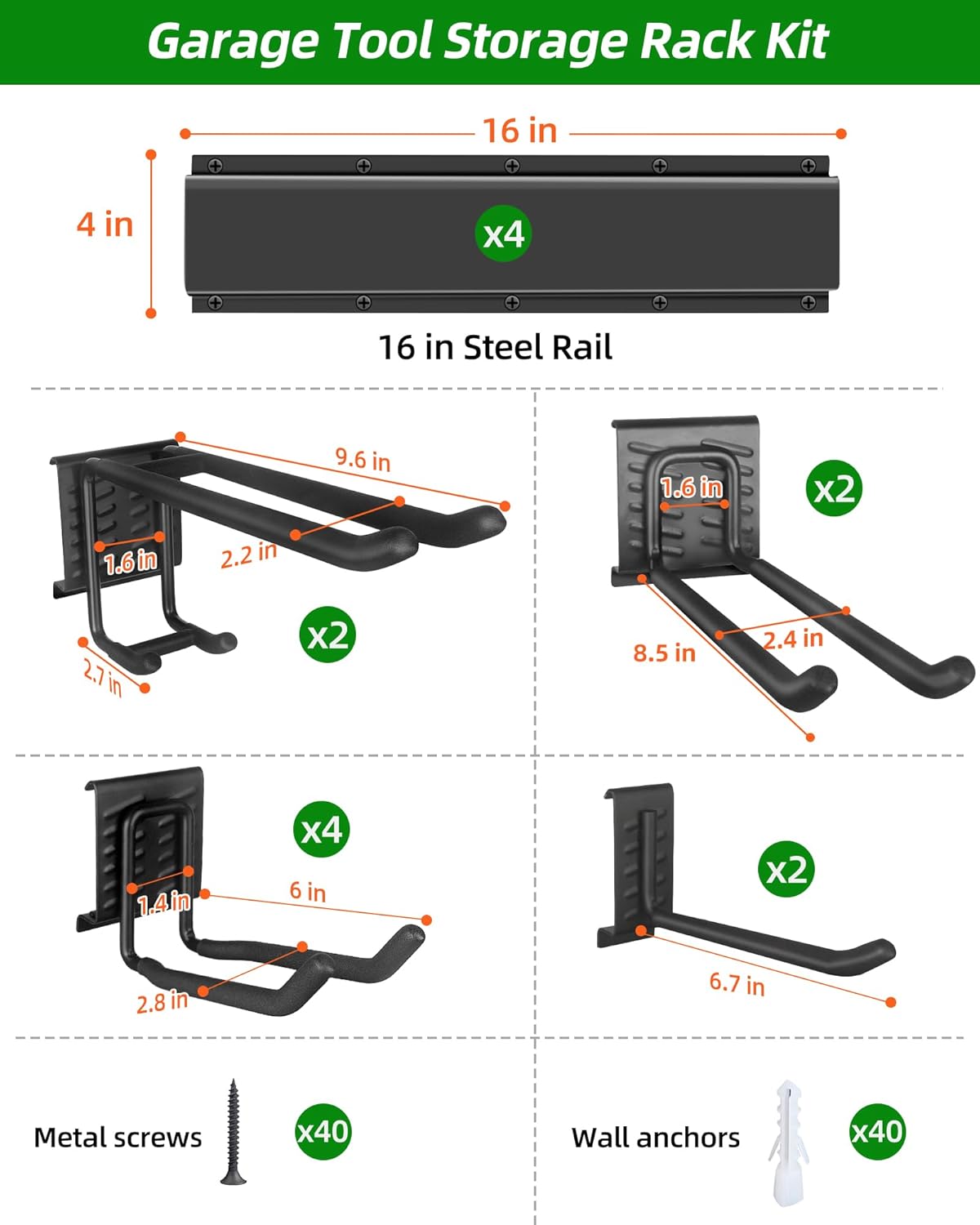 - Versatile Functionality: The 64-inch garage wall organizer kit is equipped with four types of hooks and four rails. Every rail is engineered to fit the standard 16-inch on-center stud spacing, perfect for garages, sheds, and workshops in need of robust organization