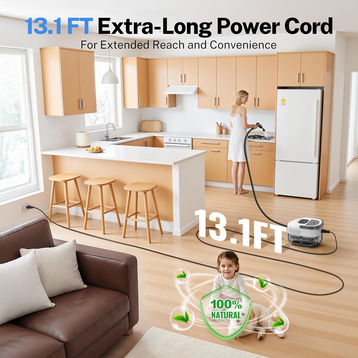 - 【Extended Reach & Portable Design】Move freely with 78" steam hose and 78" power cord. Clean high ceilings, under furniture, or car interiors without unplugging. Lightweight and compact for easy storage in tight spaces.