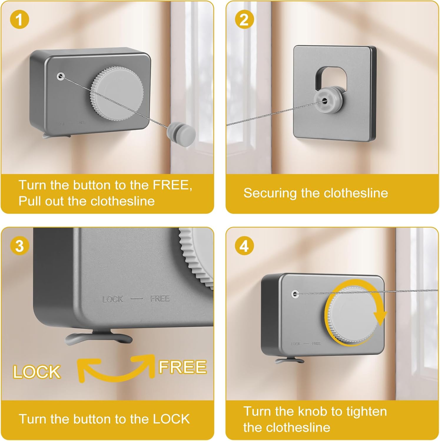 - This is an anti-sagging retractable clothesline indoor/outdoor. While keeping it locked, you can tighten the laundry line retractable by turning the knob in the middle.