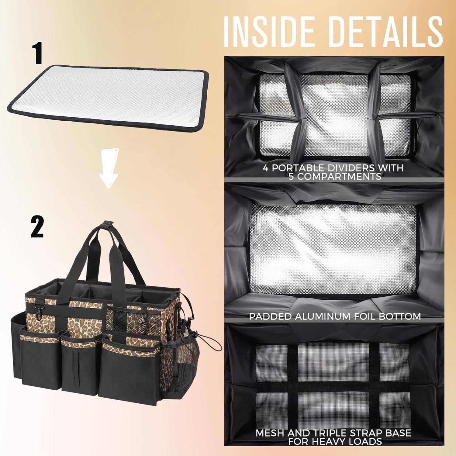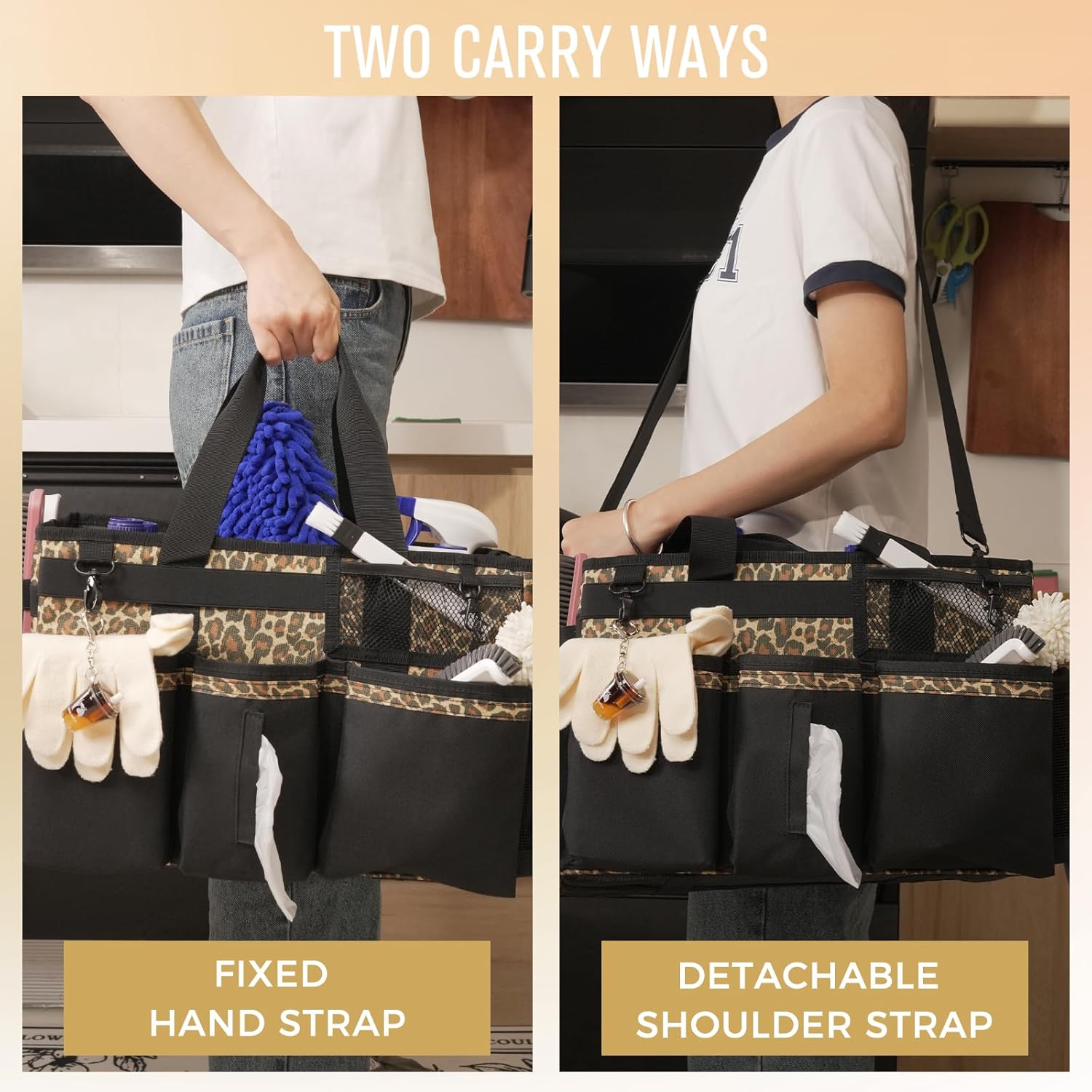 Wearable Cleaning Caddy, Cleaning Caddy Supplies Organizer with Handle & Shoulder Straps for Housekeepers, Under Sink & Car Cleaning Tool Organizers Bag with 4 Foldable Divider (Leopard)