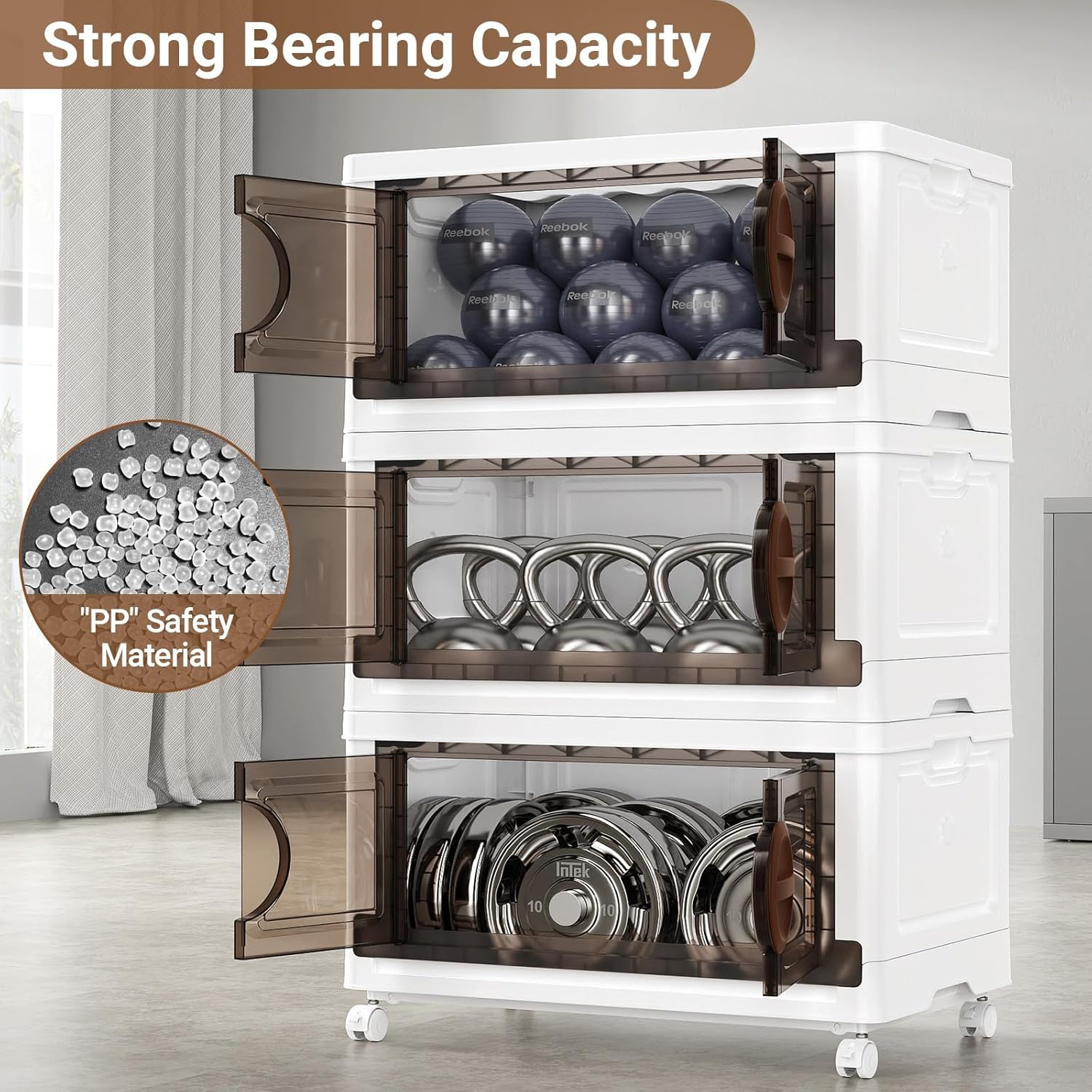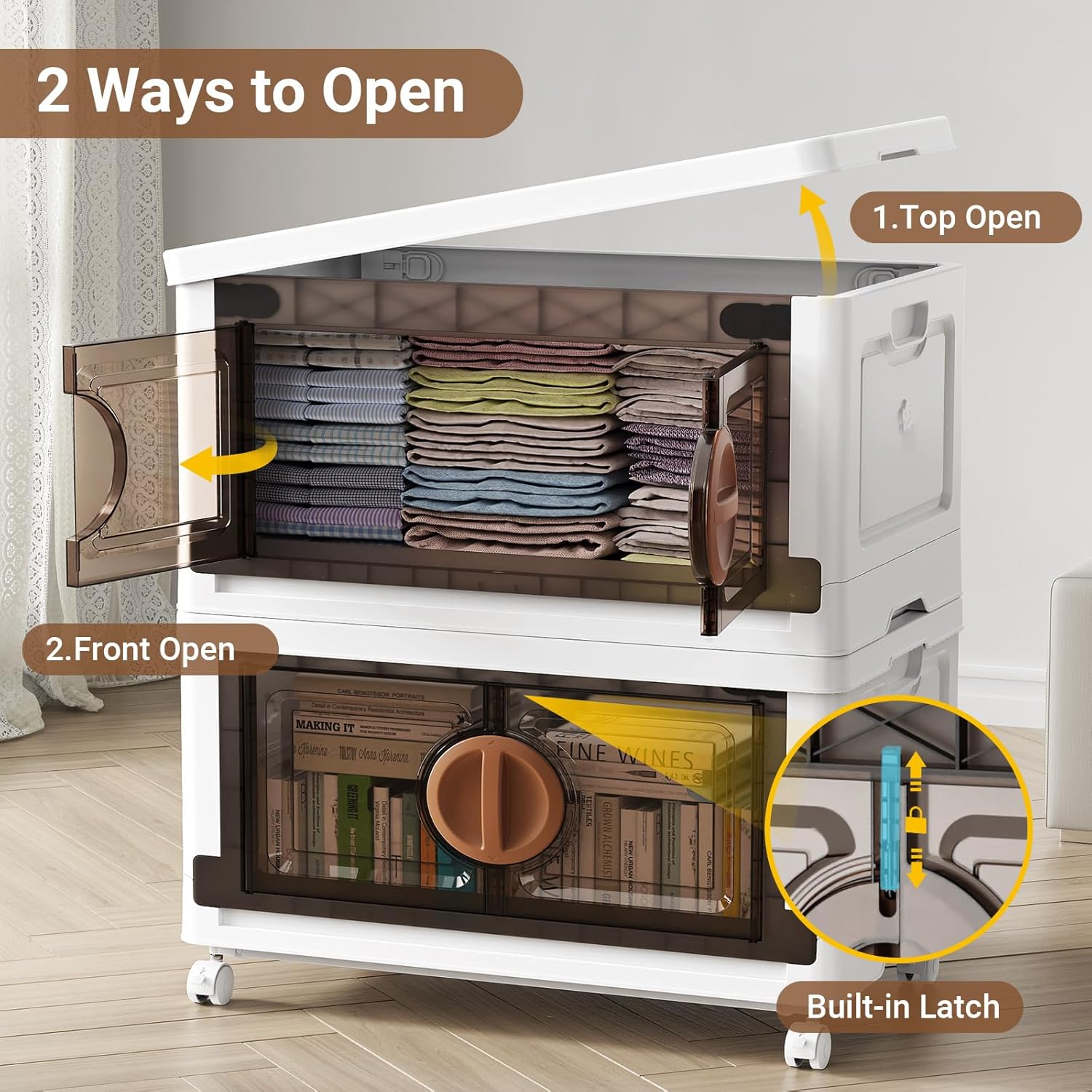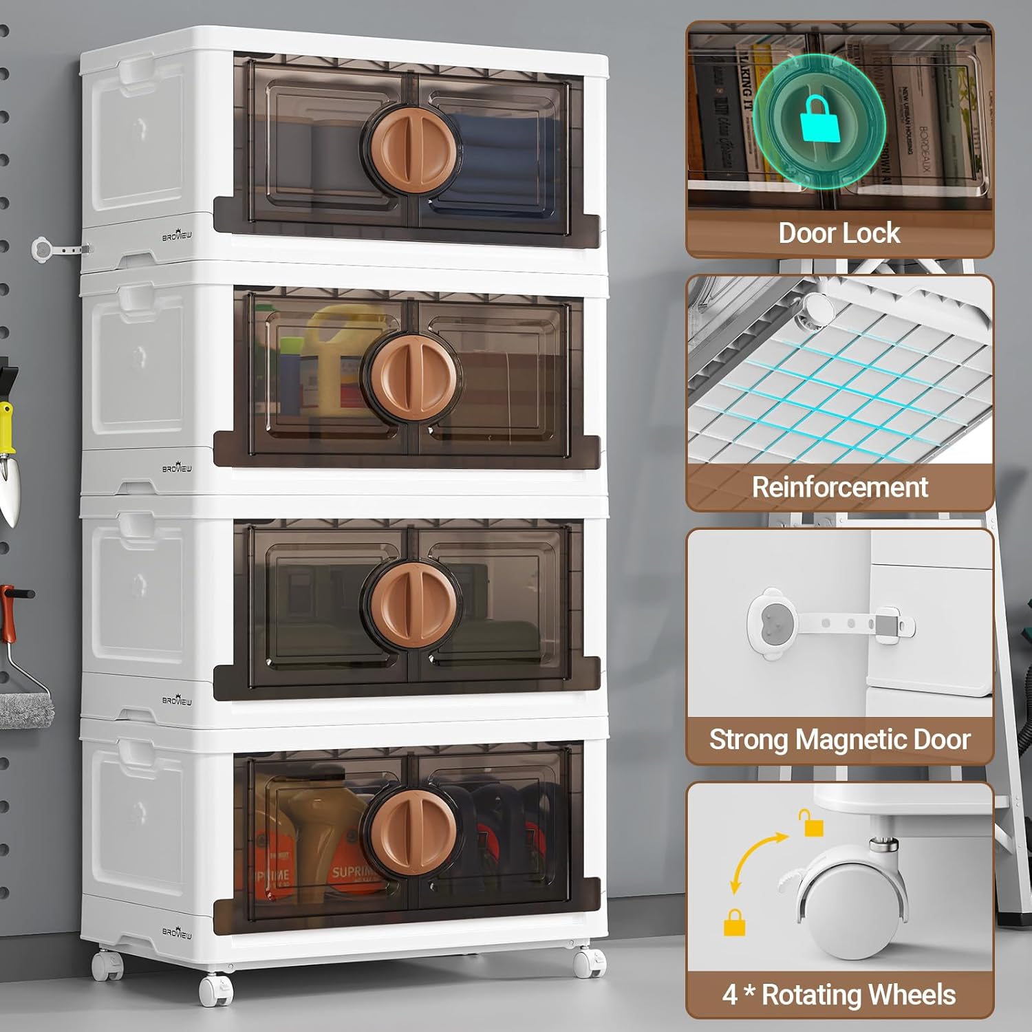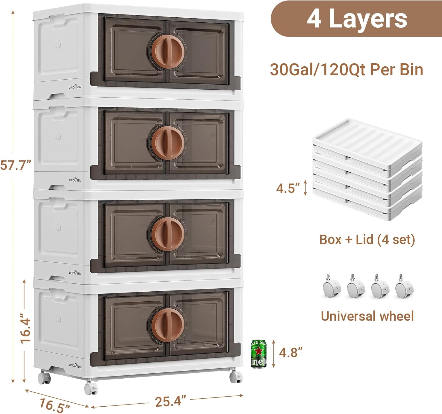 BROVIEW 480Qt Lockable Stackable Storage Bins with Lids, Closet Organizers and Storage Drawer, Collapsible Storage Bin with Wheels, Plastic Cabinet for Toy Clothes Dorm Organizer, V9 4 Pack Brown