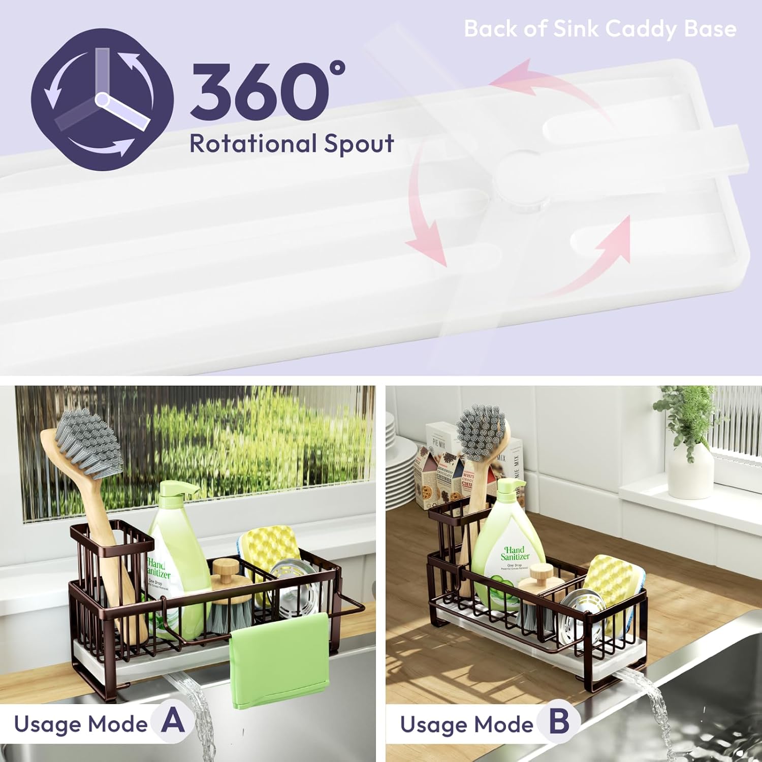 - [Automatic Draining]: Are you tired of cleaning the countertop?SWTYMIKI sponge holder for kitchen sink with 360° rotatable draining pipe can help you! Just put the sink caddy next to the sink, the water will drain automatically into the sink