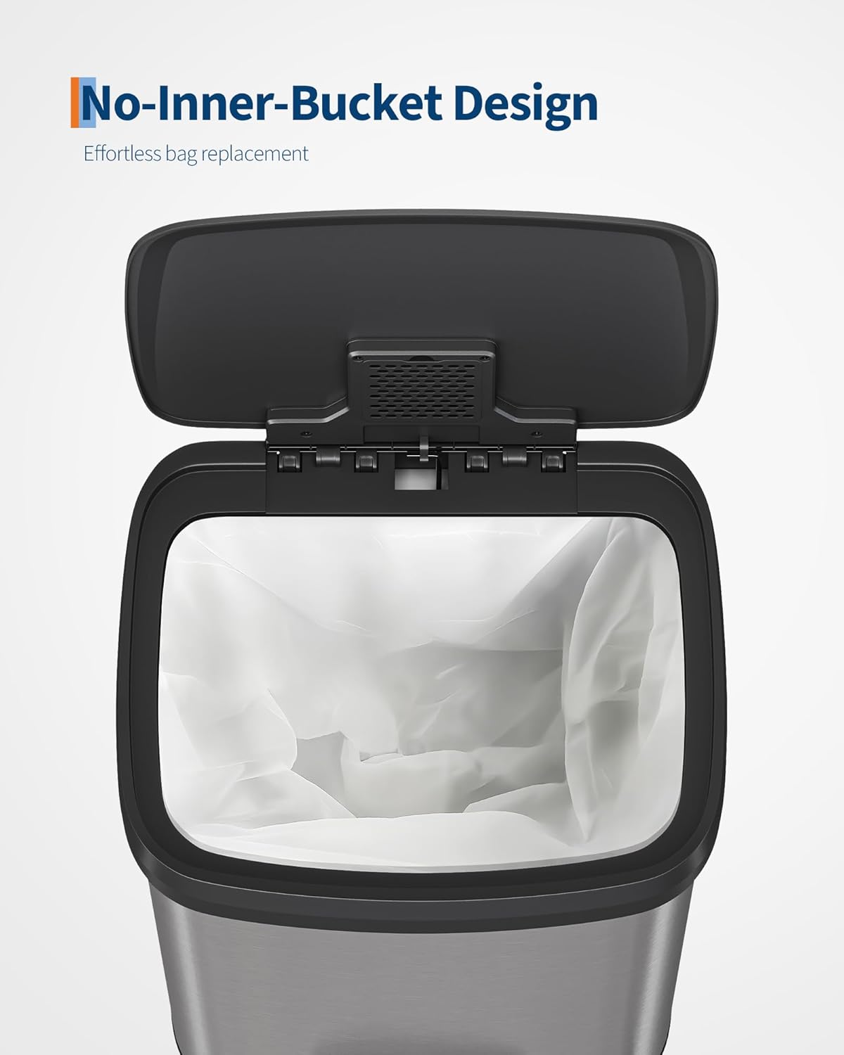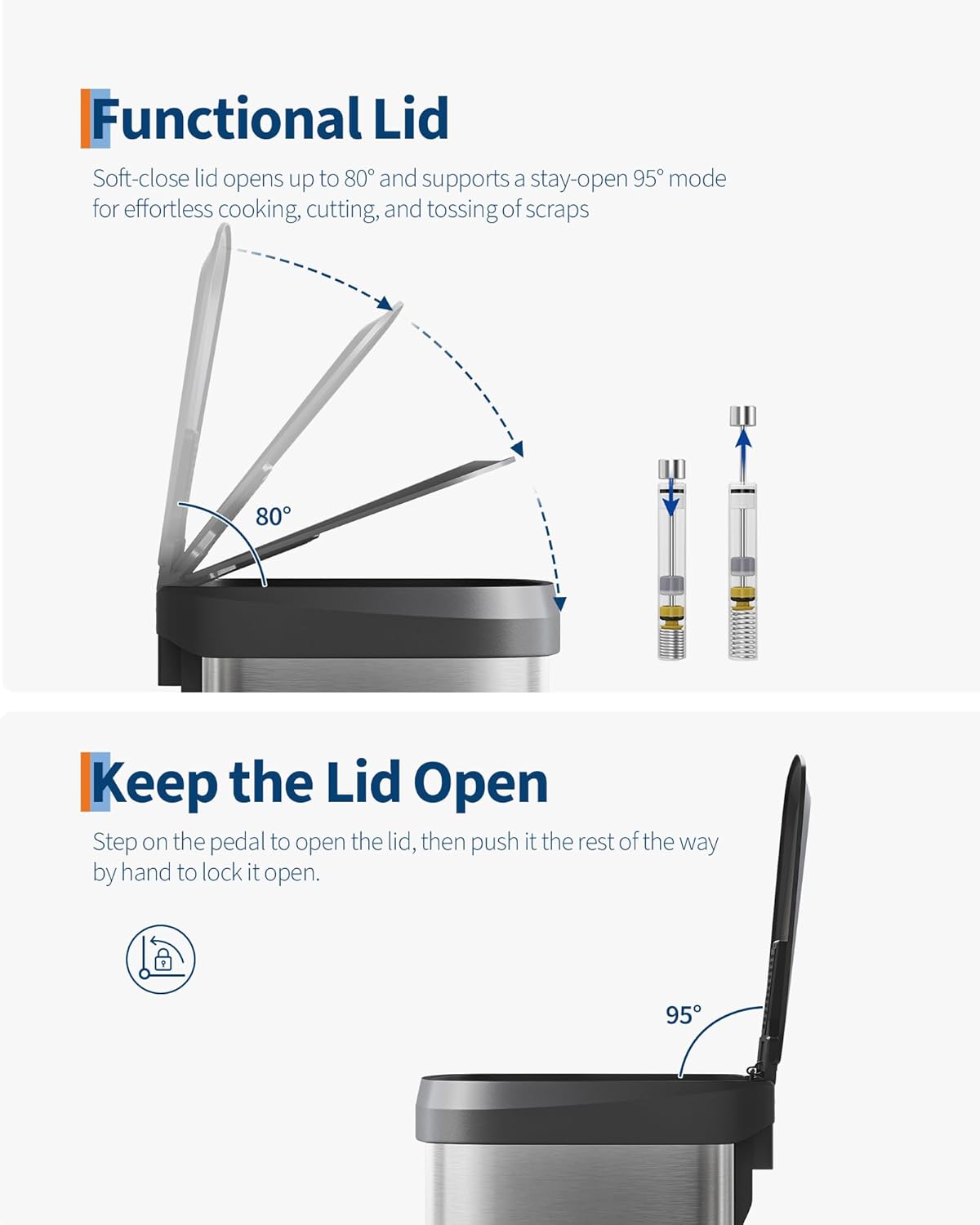 - [PRACTICAL DESIGN] – The Garvee's tall step-on kitchen trash can prioritizes ease of use with an ergonomic rear handle for effortless lifting and relocation. The soft-close lid opens smoothly to 80° without hitting island edges and locks at 95° for hands-free cooking prep and scrap disposal. The integrated liner rim secures any standard bag snugly to prevent slips, bunching, or overhang