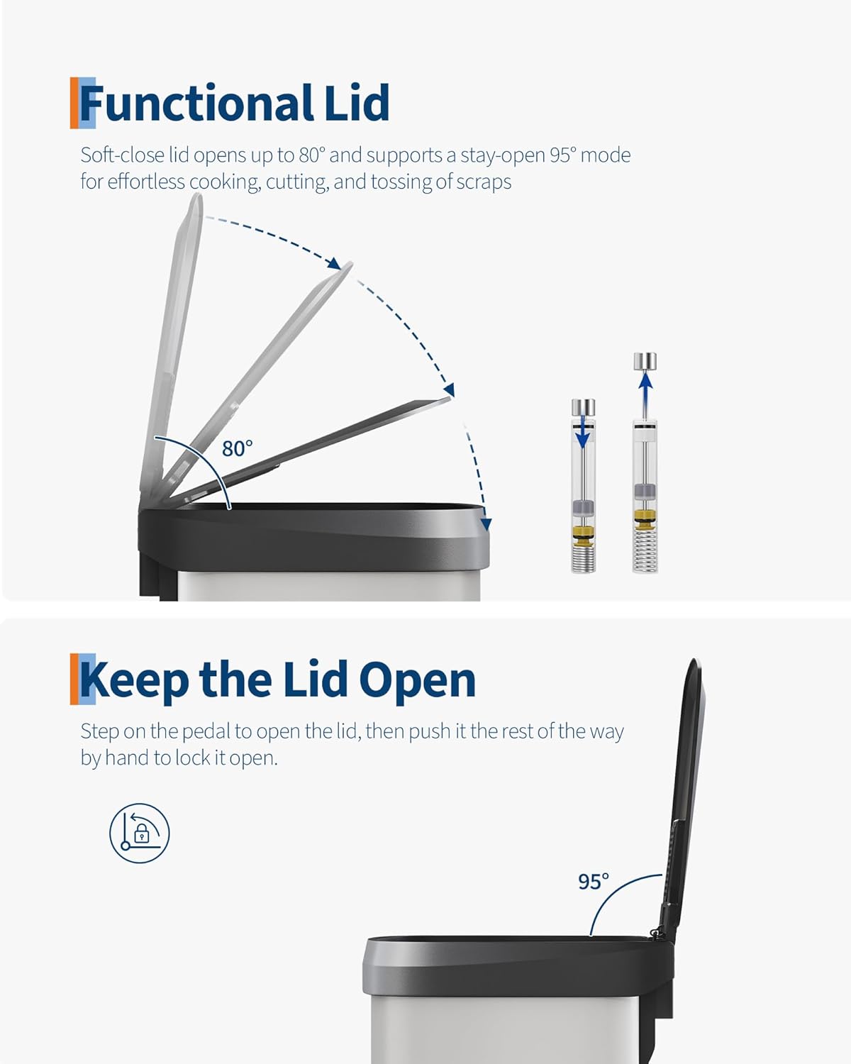 - [PRACTICAL DESIGN] – The Garvee’s tall step-on kitchen trash can prioritizes ease of use with an ergonomic rear handle for effortless lifting and relocation. The soft-close lid opens smoothly to 80° without hitting island edges and locks at 95° for hands-free cooking prep and scrap disposal. The integrated liner rim secures any standard bag snugly to prevent slips, bunching, or overhang