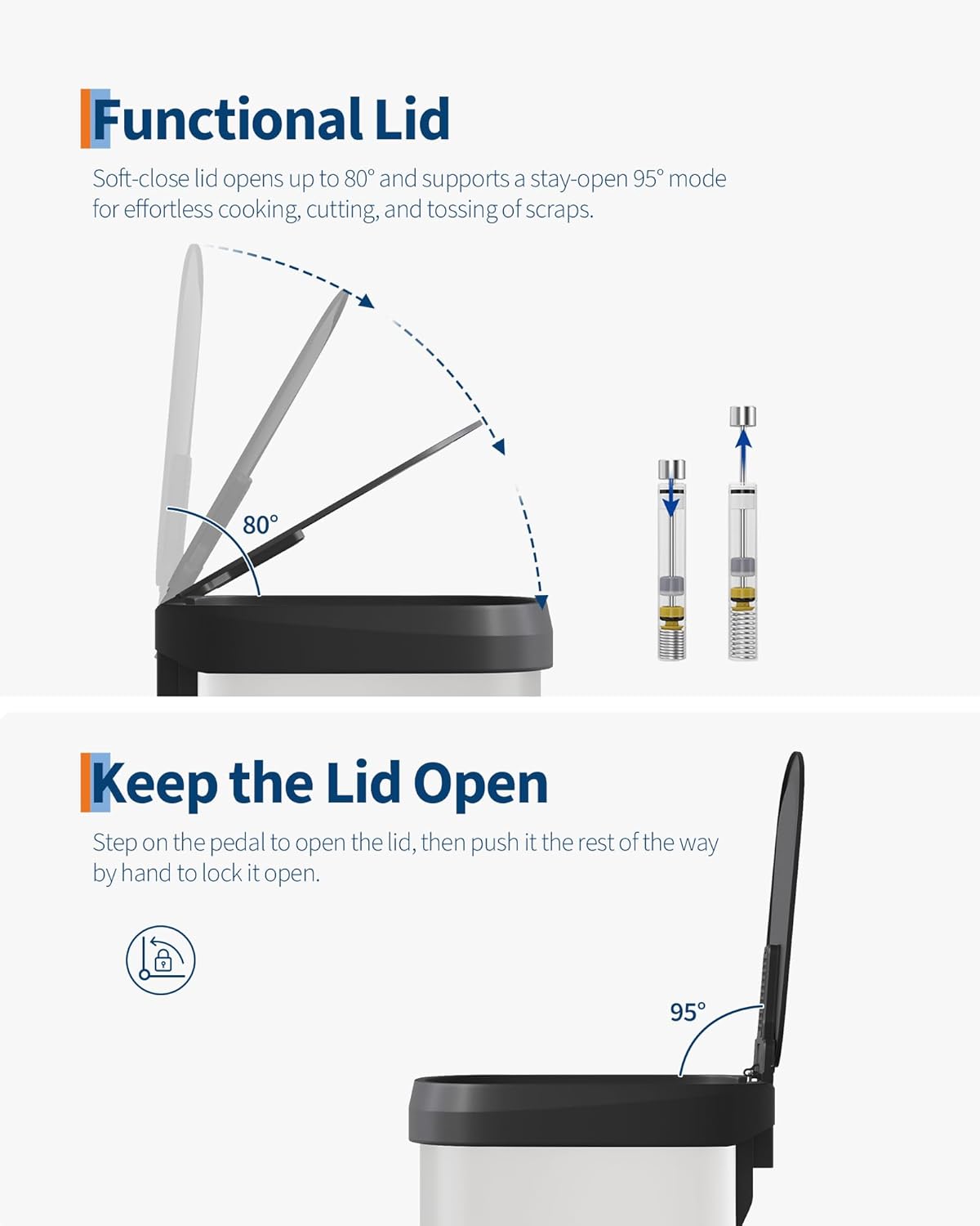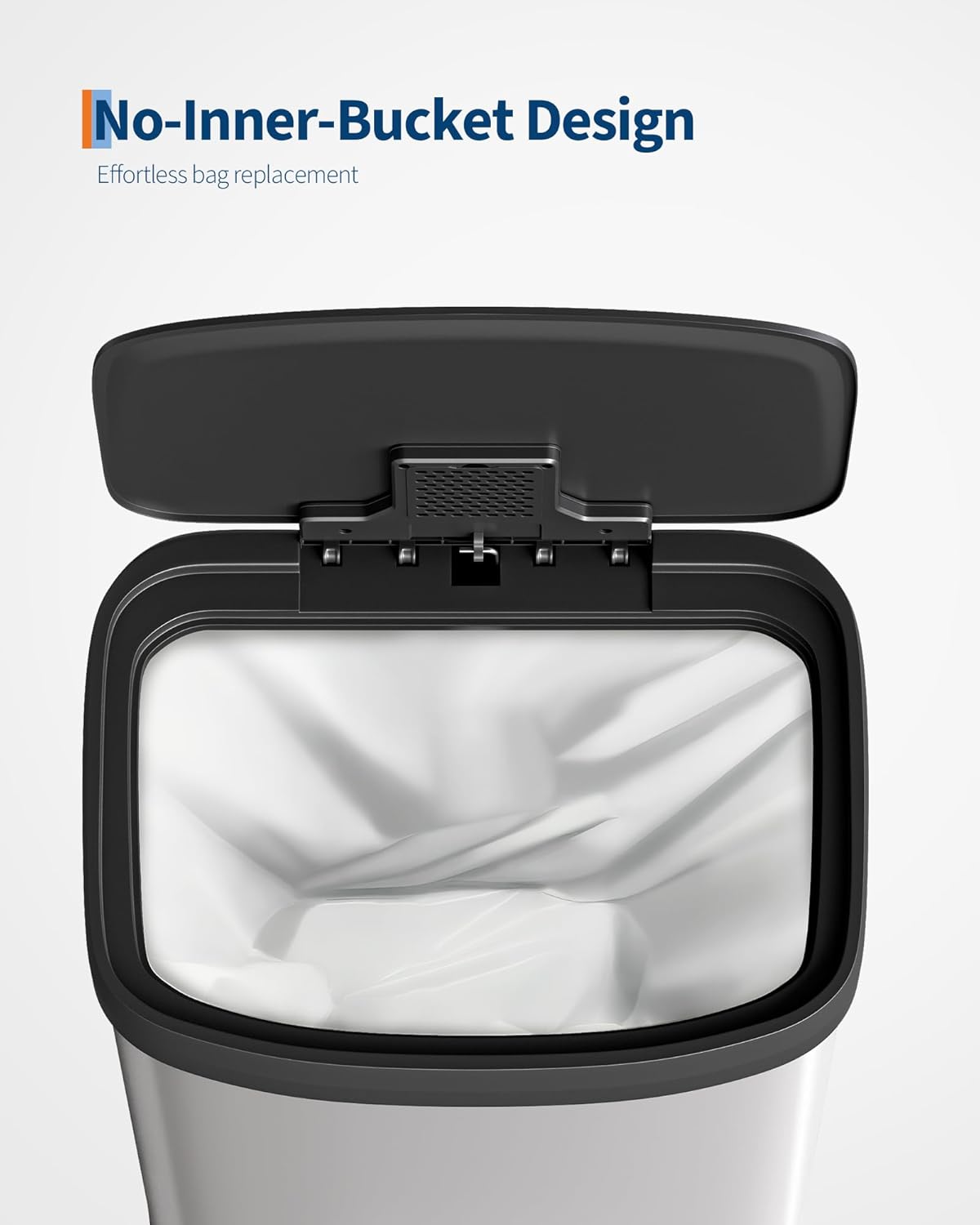 - [PRACTICAL DESIGN] – The Garvee’s tall step-on kitchen trash can prioritizes ease of use with an ergonomic rear handle for effortless lifting and relocation. The soft-close lid opens smoothly to 80° without hitting island edges and locks at 95° for hands-free cooking prep and scrap disposal. The integrated liner rim secures any standard bag snugly to prevent slips, bunching, or overhang