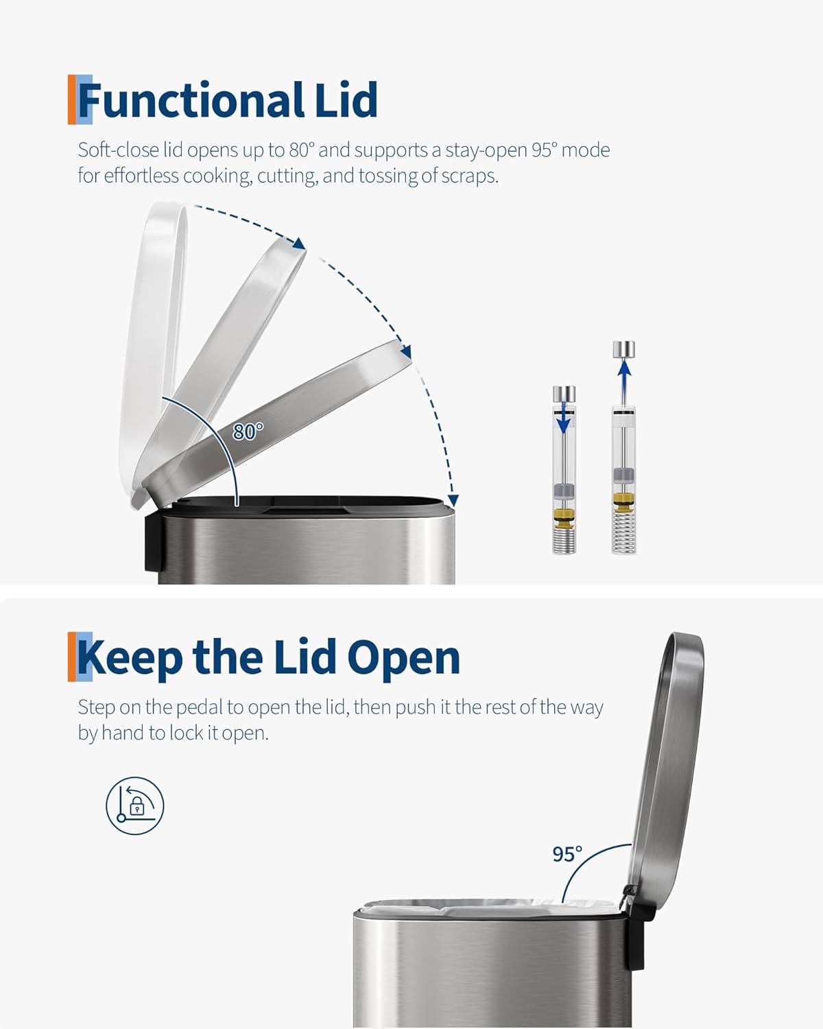 - [PRACTICAL DESIGN] – The Garvee's tall step-on kitchen trash can prioritizes effortless operation. The ergonomic rear handle makes lifting and relocation a breeze. The soft-close lid glides open to 80° and locks at 95° for hands-free stay-open use. The inner bucket with lid traps odors, and the custom liner ring grips any standard bag to prevent slips, bunching, or overhang