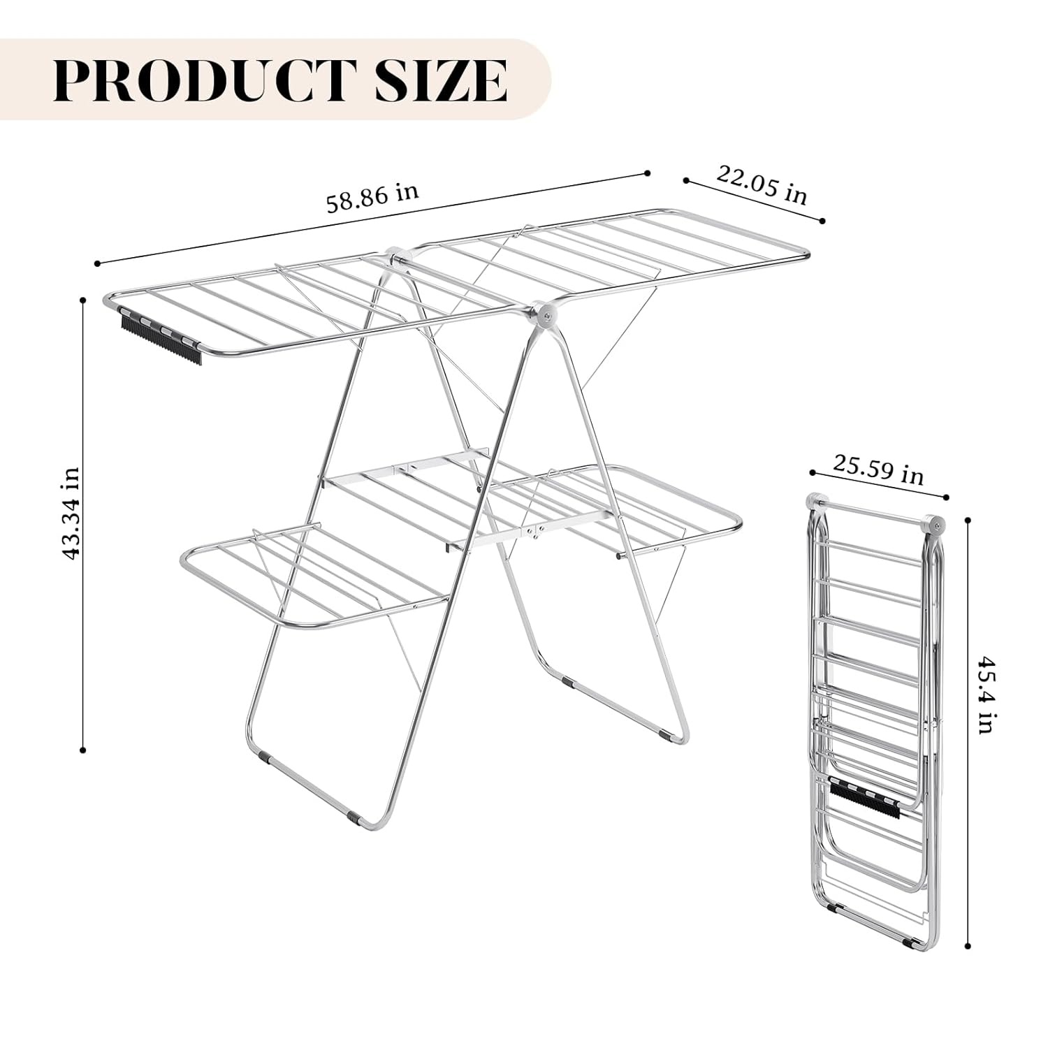 - Large Capacity with Sock Clips: When you unfold this drying rack, it has 4 wings and 2 layers of drying space—upper and lower. It comes with sock clips that can hold up to 28 pairs of socks. The fully expanded dimensions are: 58.86" L x 43.34" H x 22.05" W. The big capacity makes drying stuff way easier.