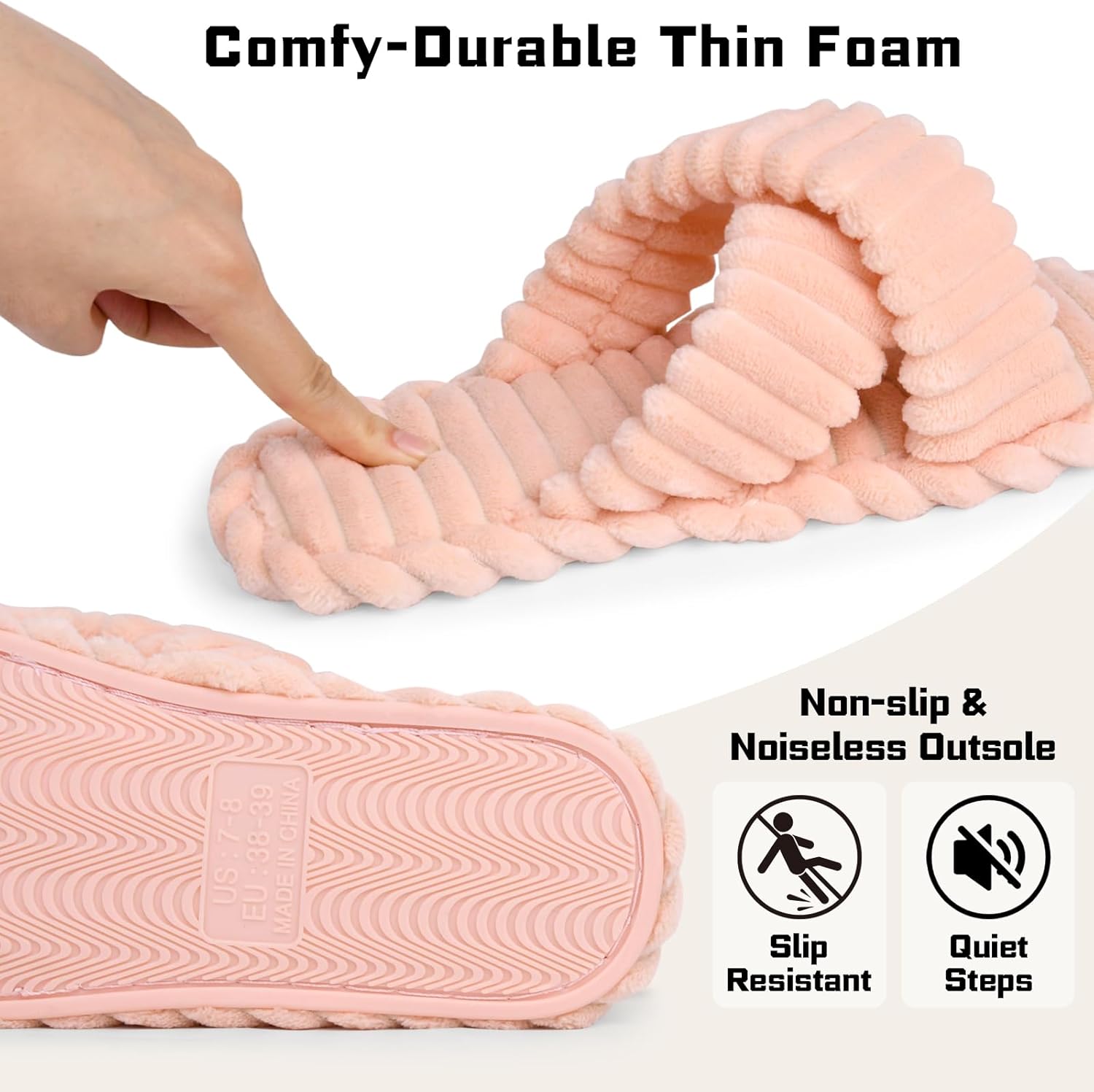 - ★Comfy-Durable Thin Foam - The durable comfy thin foam of bottom will perfectly fit the shape of your foot, firm yet yielding, will not only make you have the great wrapping sensation, but also provide cushioning and supporting for quiet, noiseless steps.