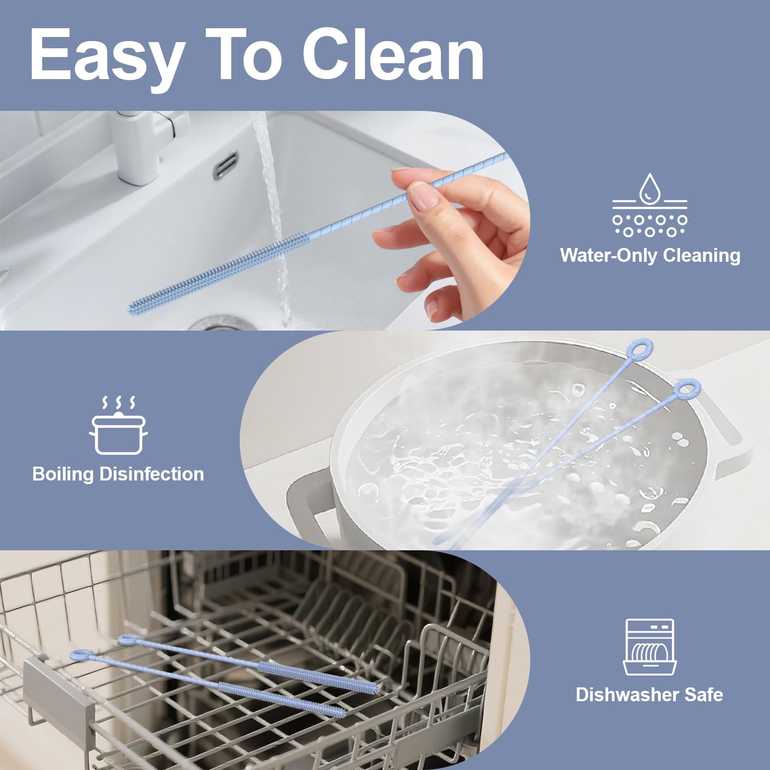- Safe & Durable Silicone Bristles: Made from high-quality, food-grade silicone, BPA Free, our straw brush are gentle on straws (won't scratch) yet tough on buildup. The flexible Handle bend to scour every curve and corner for a thorough clean, and won't shed or break like bristle brushes.