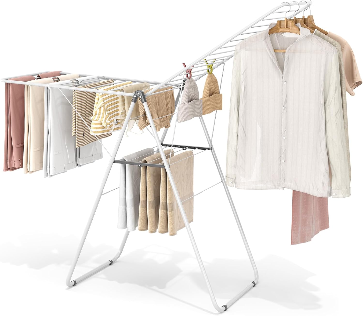 - Large drying space: 2-tier foldable rack. Top wings (70 inches) for quilts; 32 rods total, with the second tier for small items like socks/towels. Enough for the whole family.