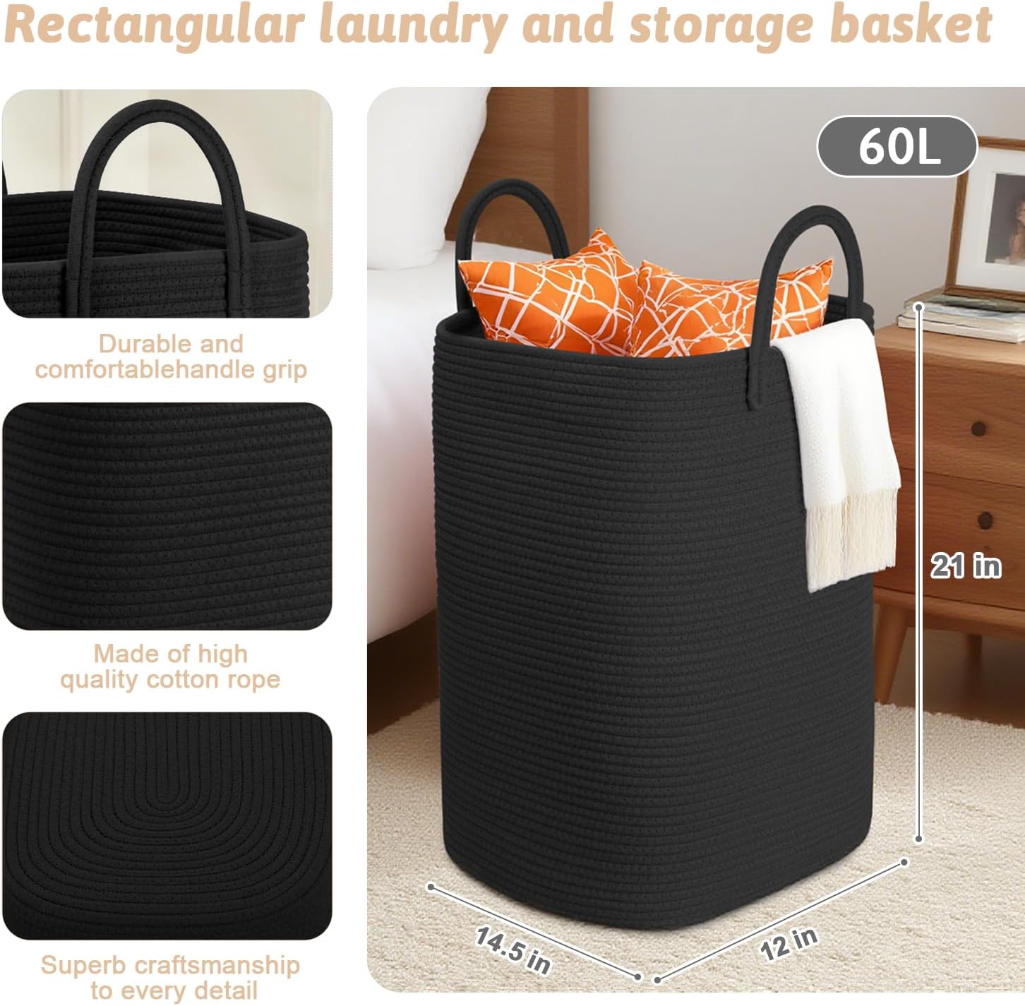 Laundry Basket,Woven Cotton Rope Laundry Hamper,60L Versatile Storage for Dirty Clothes,Baby Toys,and Blankets in Bathroom, Nursery,and Living Room