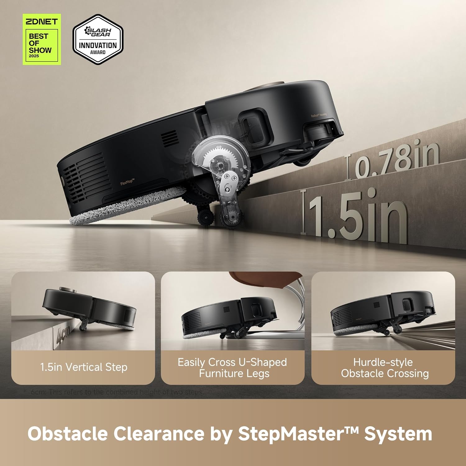 - Synchronous Obstacle Avoidance: The StepMaster system features a design with extendable wheels that lift the device to effortlessly overcome obstacles such as steps, thresholds, door edges and U-shaped furniture legs, as well as two-layer sleepers up to 2.36 inches tall. A single obstacle or vertical step it overcomes up to a height of 1.6 inch.