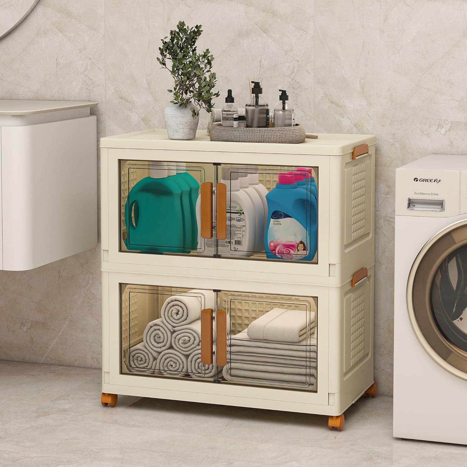 - ELEGANT DESIGN: The storage bins's front door is transparent, allowing easy access to the contents. Each door is equipped with a handle, and the storage bin boasts a stylish and minimalist appearance, fitting seamlessly with various furniture. The foldable storage box can be stacked according to your needs, equipped with a lid at the top, and four movable wheels are built into the bottom, facilitating easy movement as required.