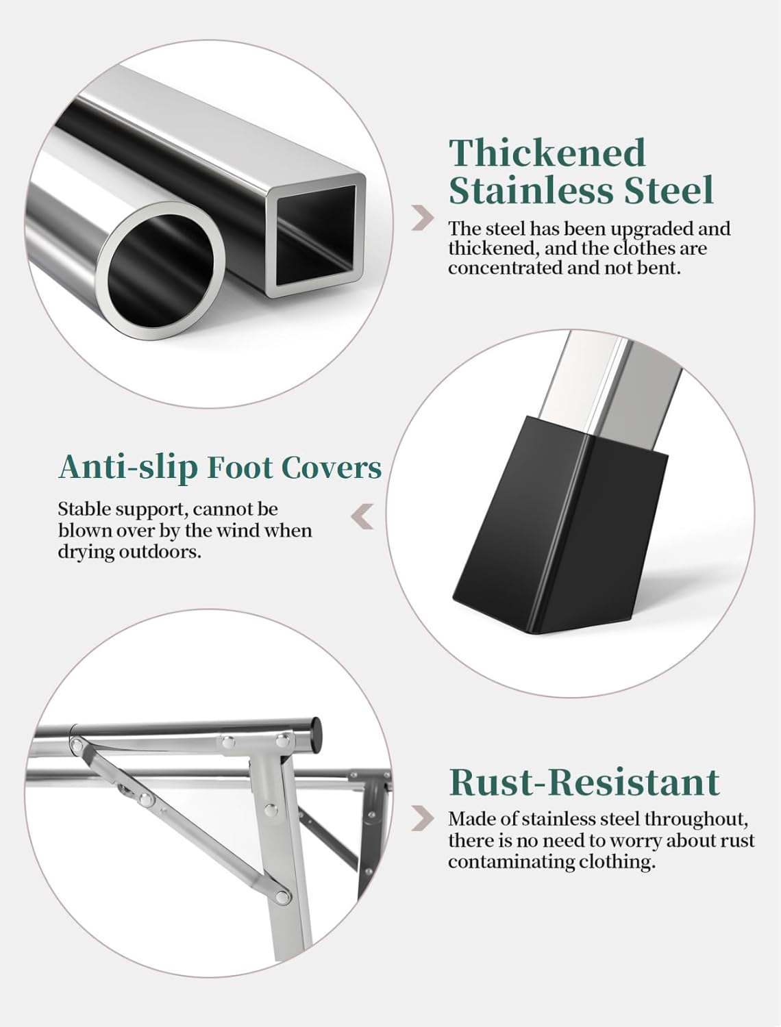 - đź‘•Quality Upgrade, Exquisite Details: This drying rack has been made of thickened stainless steel, which is durable and features a smooth and edge - free surface to prevent clothes from being scratched. The non - slip foot pads at the bottom can effectively protect the floor and ensure quiet movement, demonstrating excellent quality and reliability in every detail.
