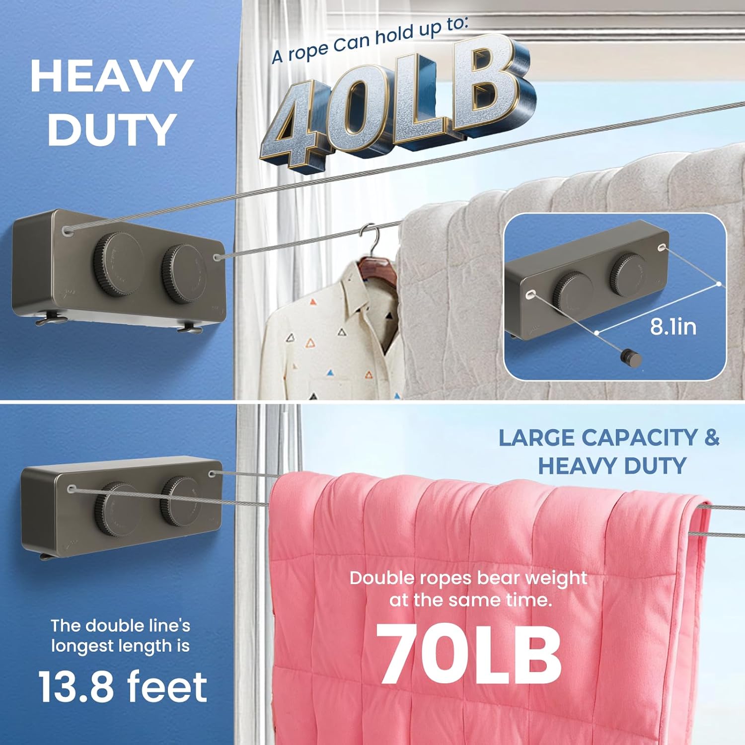 - 【Retractable Clothesline Indoor Outdoor Heavy-Duty】 Upgrade 304 Stainless Steel Clothes Line anti-sag design supports Single rope 40lb double rope use 70lb . Features a knob-locking mechanism for stable drying of heavy items like Outdoor Drying Rack Clothing blankets and jeans.