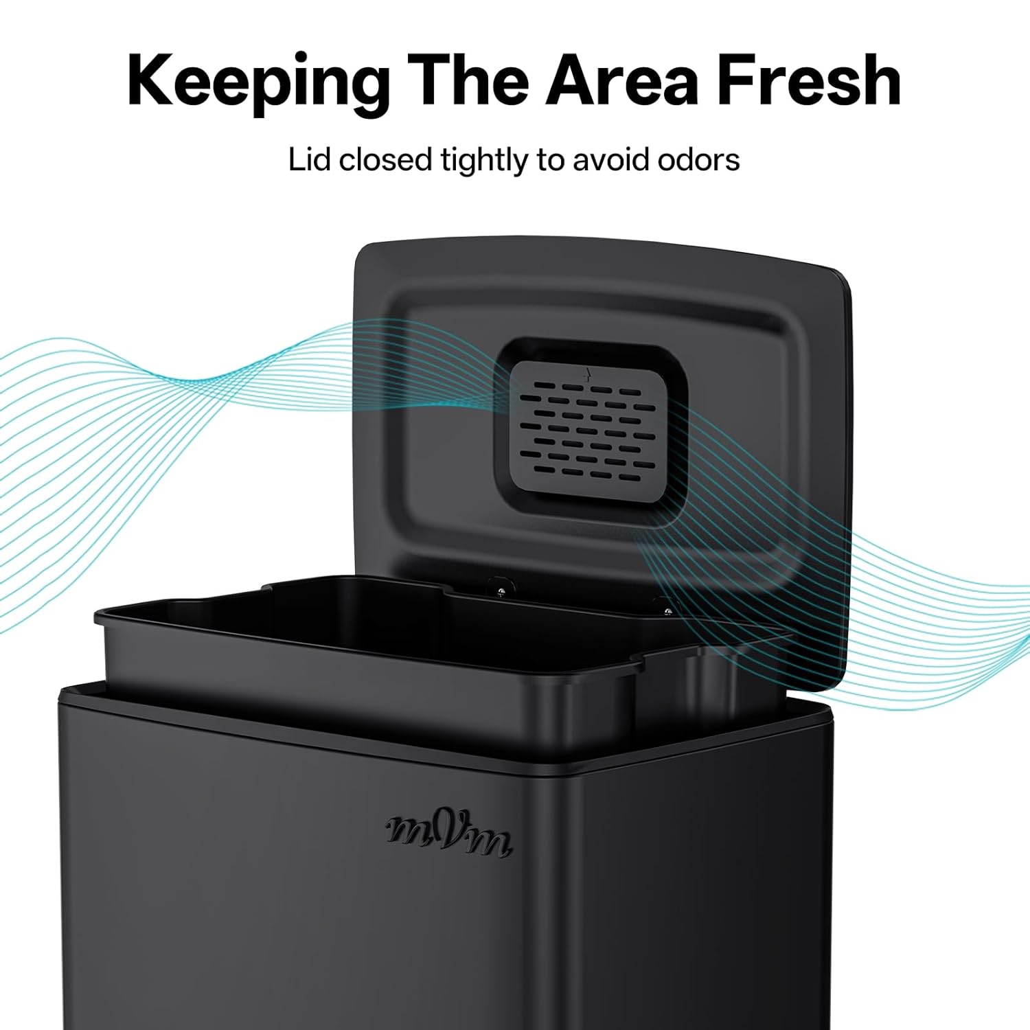 - Odor seal: The mVm trash bin is equipped with a carbon fiber filter that absorbs and neutralizes odors inside the bin, and the lid closes tightly to prevent odors from escaping.