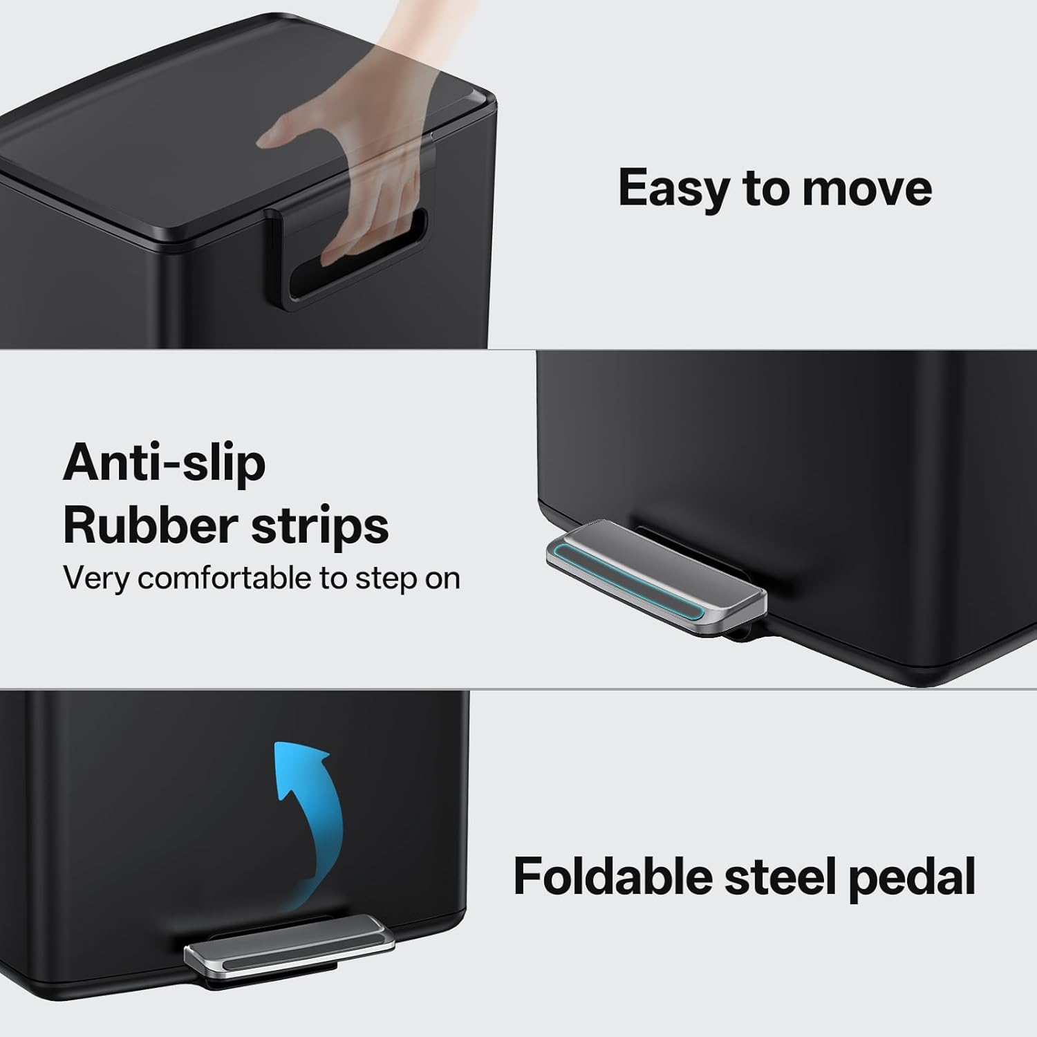 - Dwsign benefits: Garbage can with lid stays open, removable inner bucket, collapsable foot pedal and carrying handle, etc.