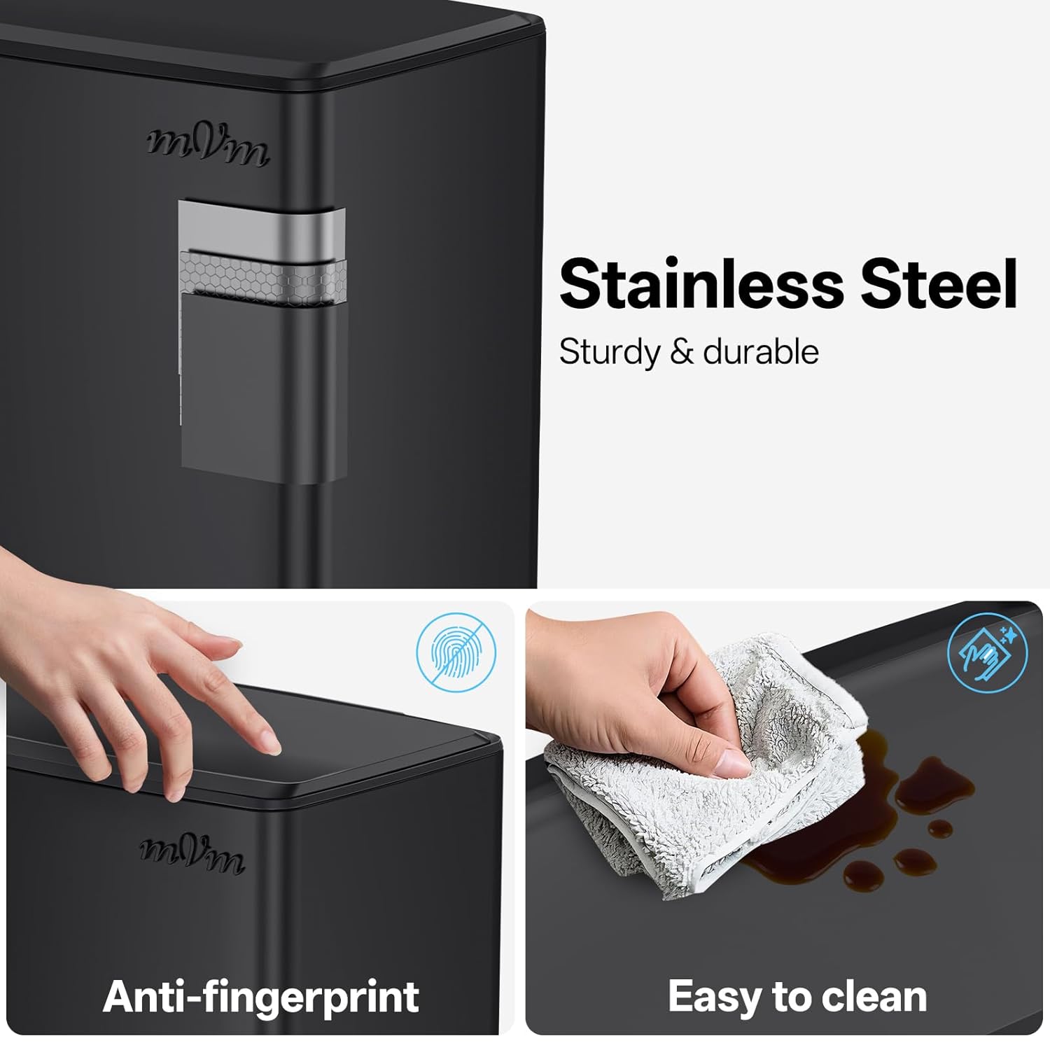 - Stainless steel: mVm trash can has a stainless steel surface, anti-fingerprint exterior and PP plastic inner bucket for reliable strength.