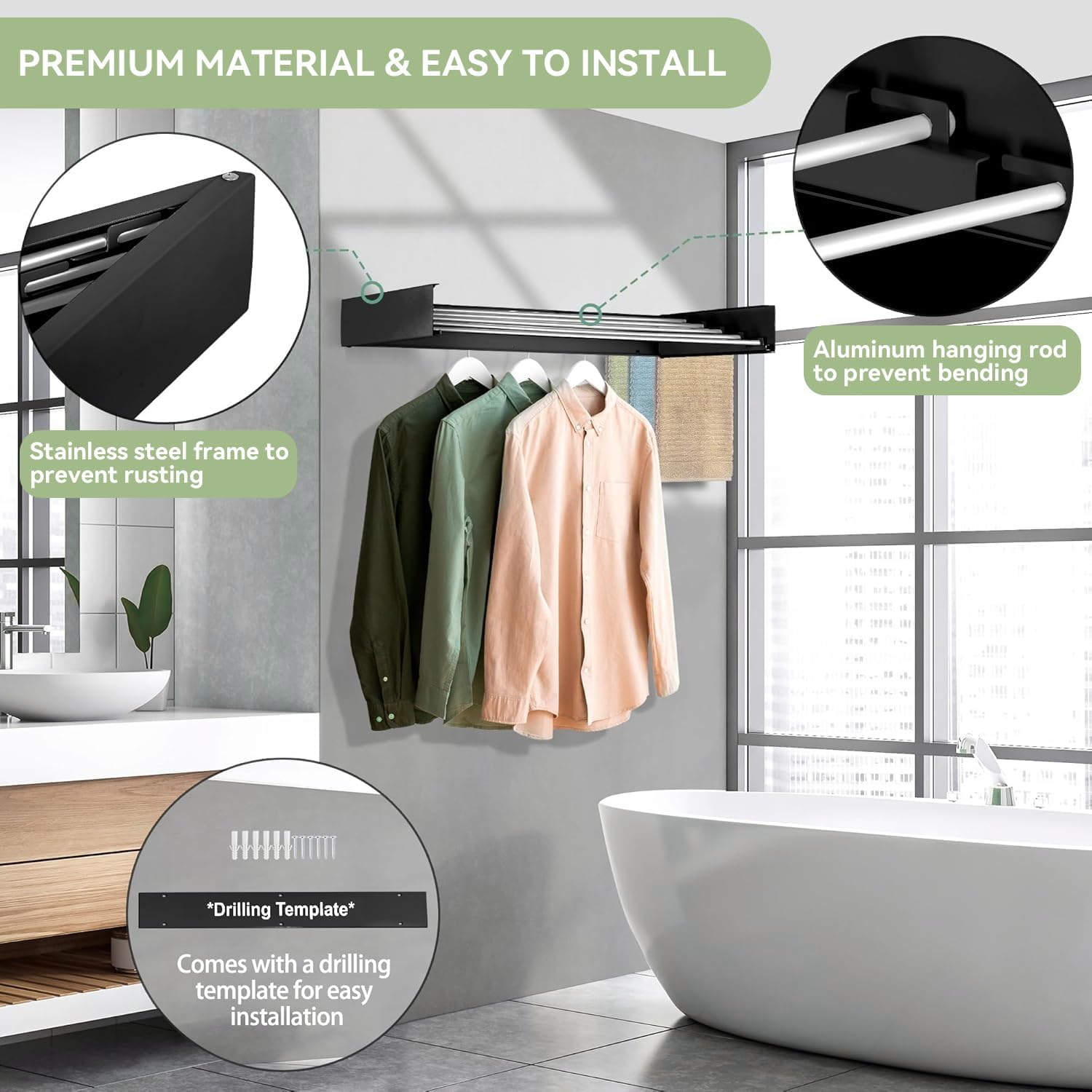 - Special Feature : 5 Drying Rods, Aluminum Construction, Collapsible, Includes Drilling Template, Wall Mounted