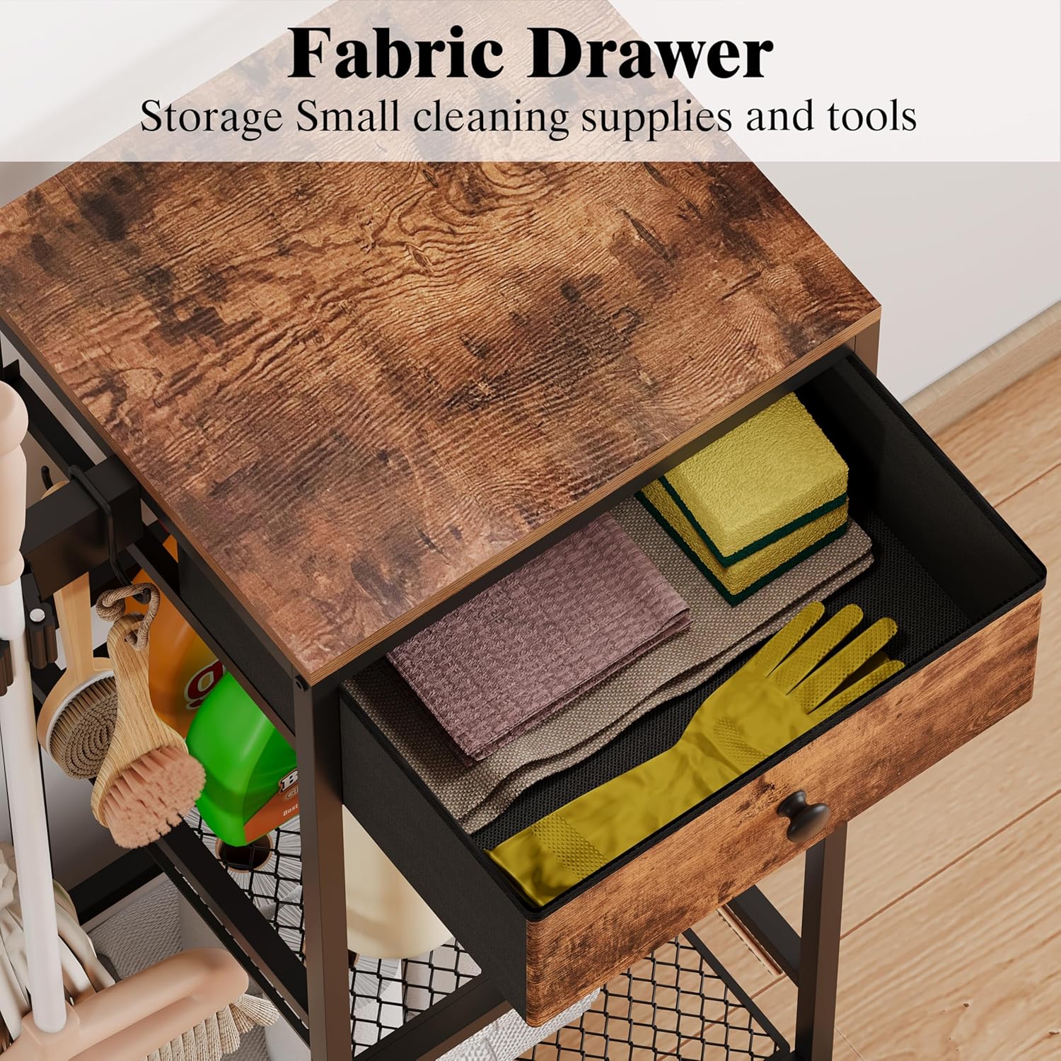 - 【Sturdy and Great Design】The Broom Closet Storage Cart is built with premium particle board and heavy duty iron frame which supports for durability. Coated with a rust-resistant finish, ensuring it stays rust-free