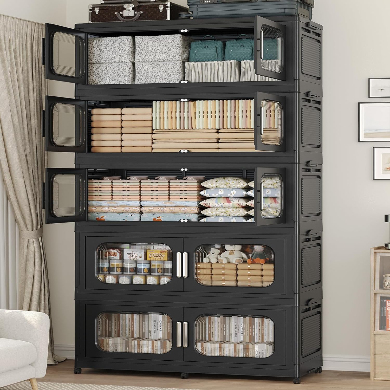 - 【Two Ways to Open & Magnetic Easy Access】The collapsible storage bins with doors and wheels feature a dual access way, allowing for both top and front door openings, and with clear brown windows for easy visibility. The extra large storage bins with open front doors are equipped with magnetic lock buckles to prevent dust from entering the cabinet.