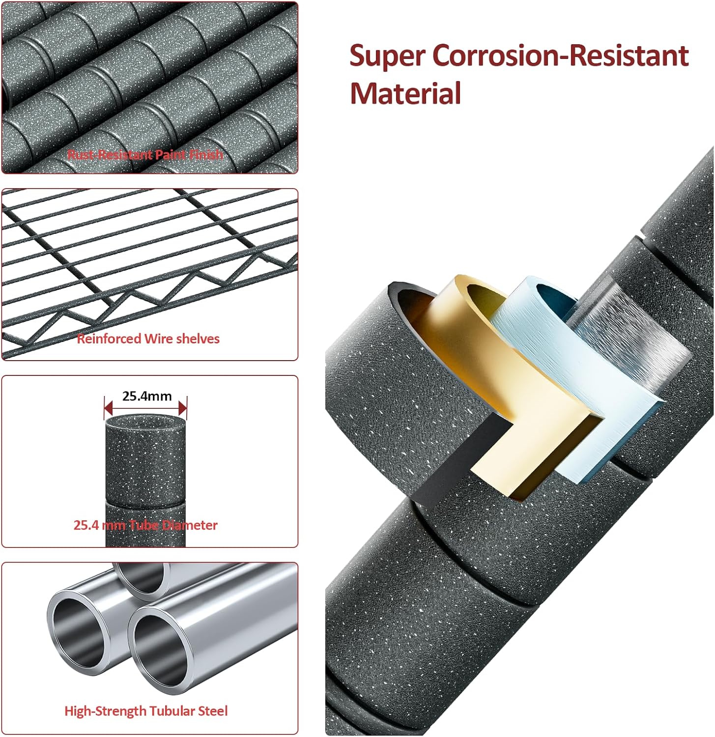 - ăRust-Resistant & Corrosion-Proof Coatingă Crafted from premium steel with a protective powder-coated finish, the rack effectively resists rust, corrosion, and moistureâideal for humid or outdoor environments.