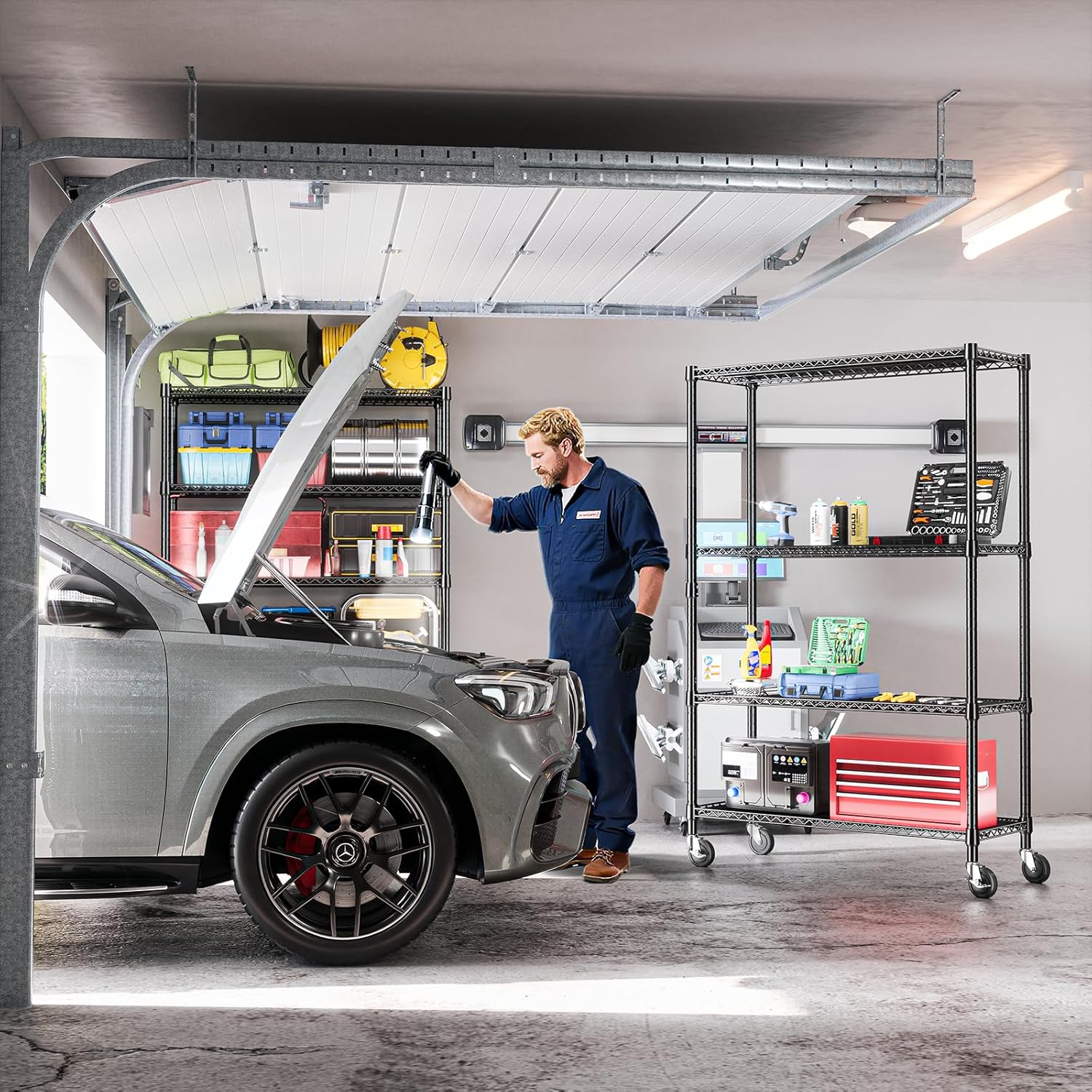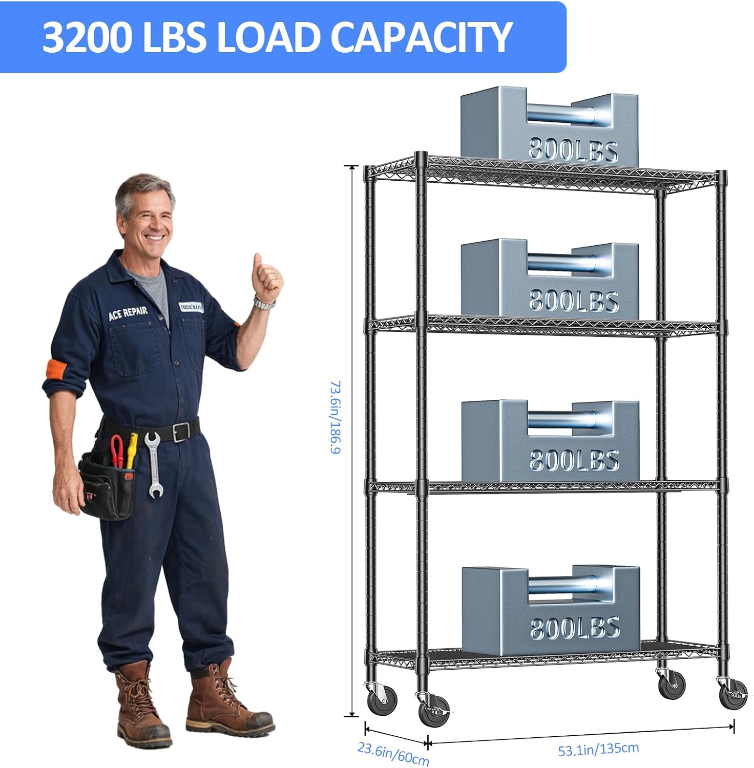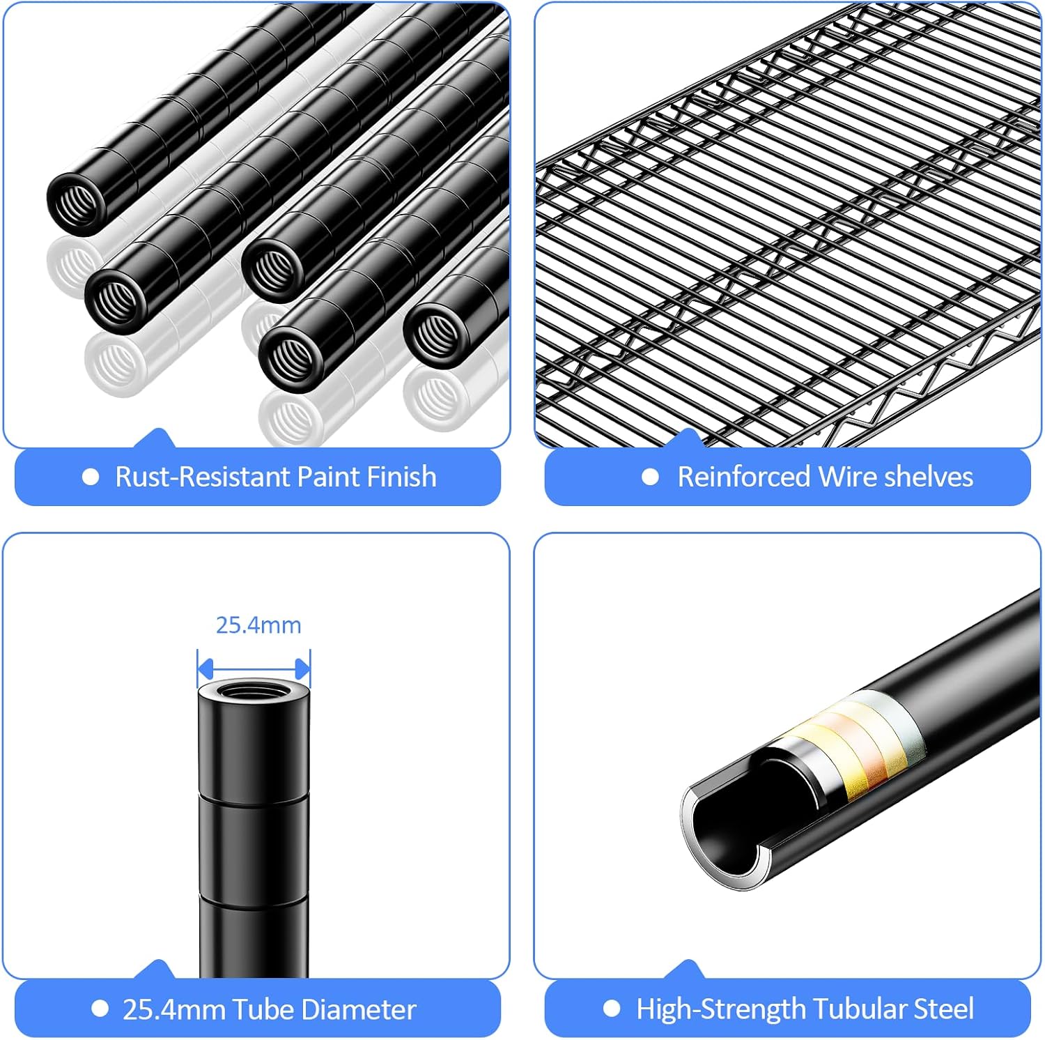 - COMMERCIAL-GRADE HEAVY DUTY โ Built with premium carbon steel and 25.4mm thick metal rods, each shelf supports up to 660 lbs on leveling feet, with a total capacity of 2200 lbs (approx. 530 lbs on wheels). Perfect for heavy-duty storage needs.