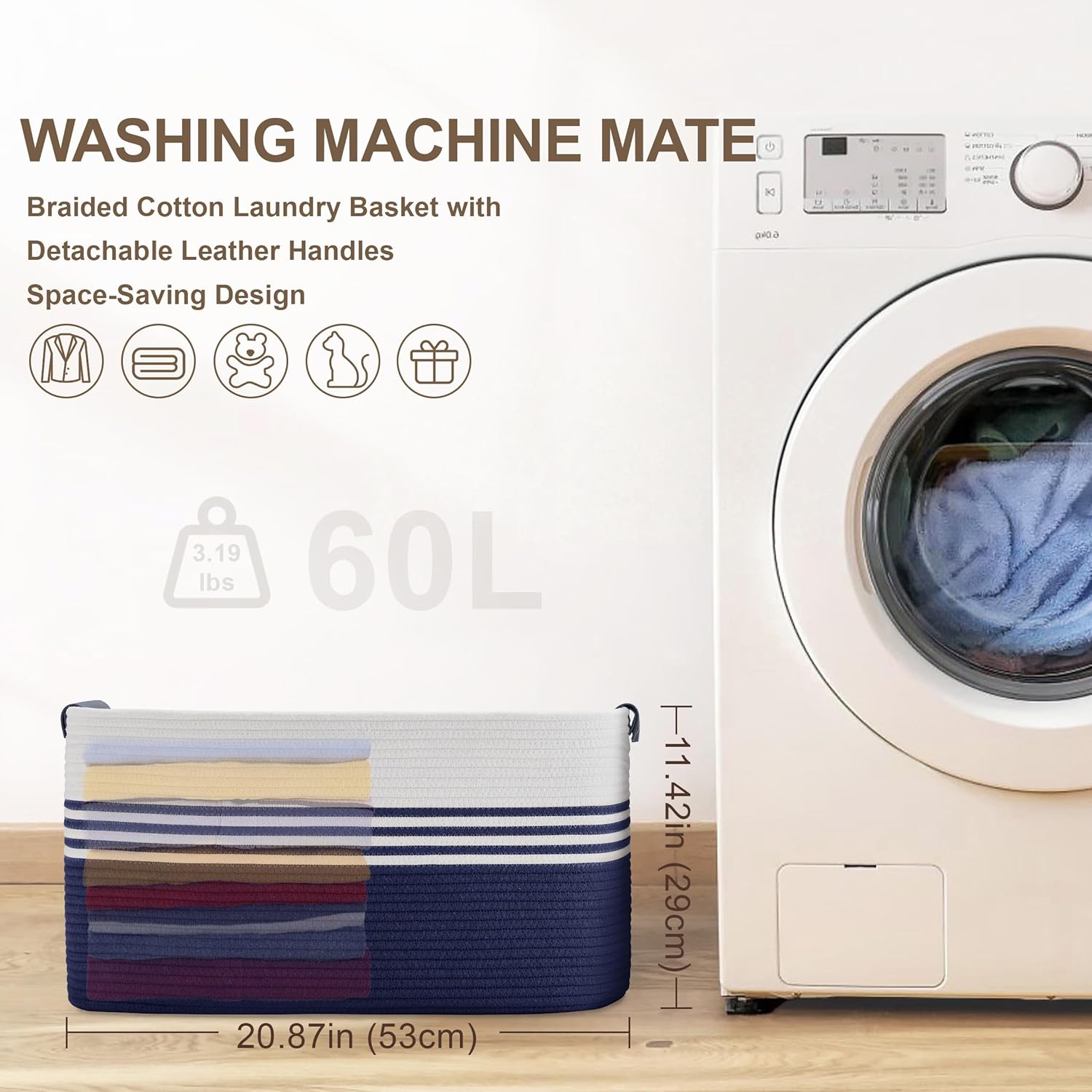 60L Large Laundry Basket with Leather Handles for Living Room Storage, Woven Rope Baskets Bin for Blanket, Kids Toy, Gifts, Wicker Hamper for Bedroom Dirty Clothes, 21"x15"x11" White Navy