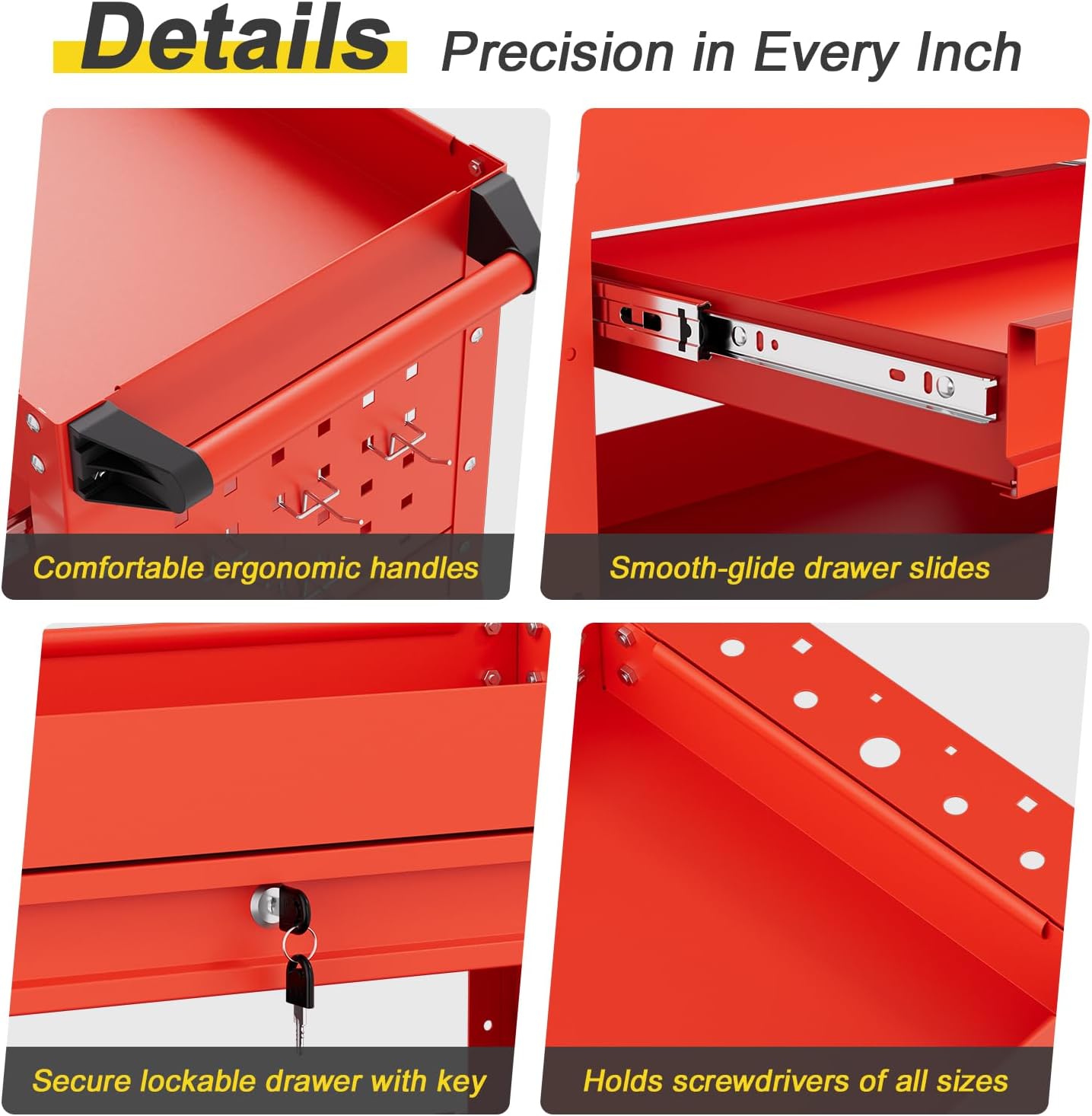 - Ample Tool Storage β This rolling tool cart with drawers features 3 trays, 1 lockable drawer, side hooks, and panels for tools and accessories. Ideal tool cart on wheels for shops and home use.