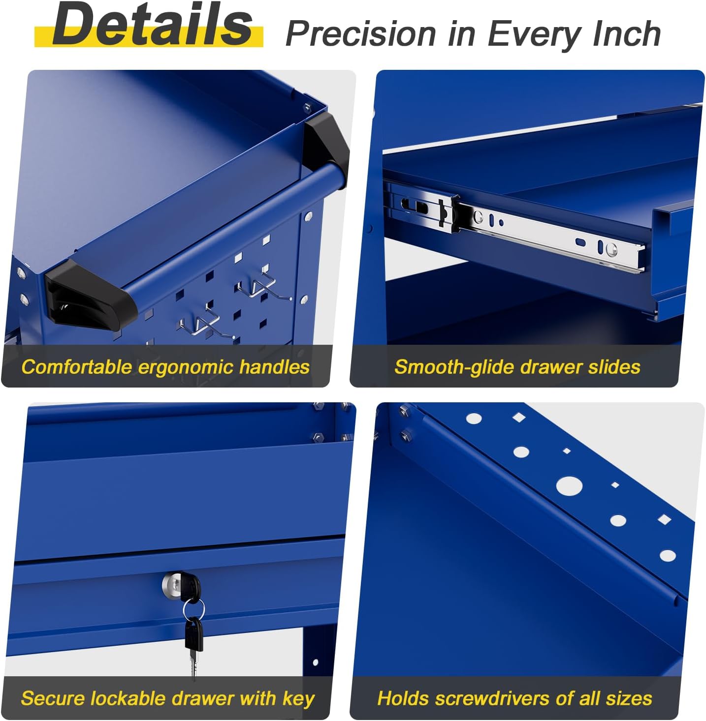 - Ample Tool Storage β This rolling tool cart with drawers features 3 trays, 1 lockable drawer, side hooks, and panels for tools and accessories. Ideal tool cart on wheels for shops and home use.