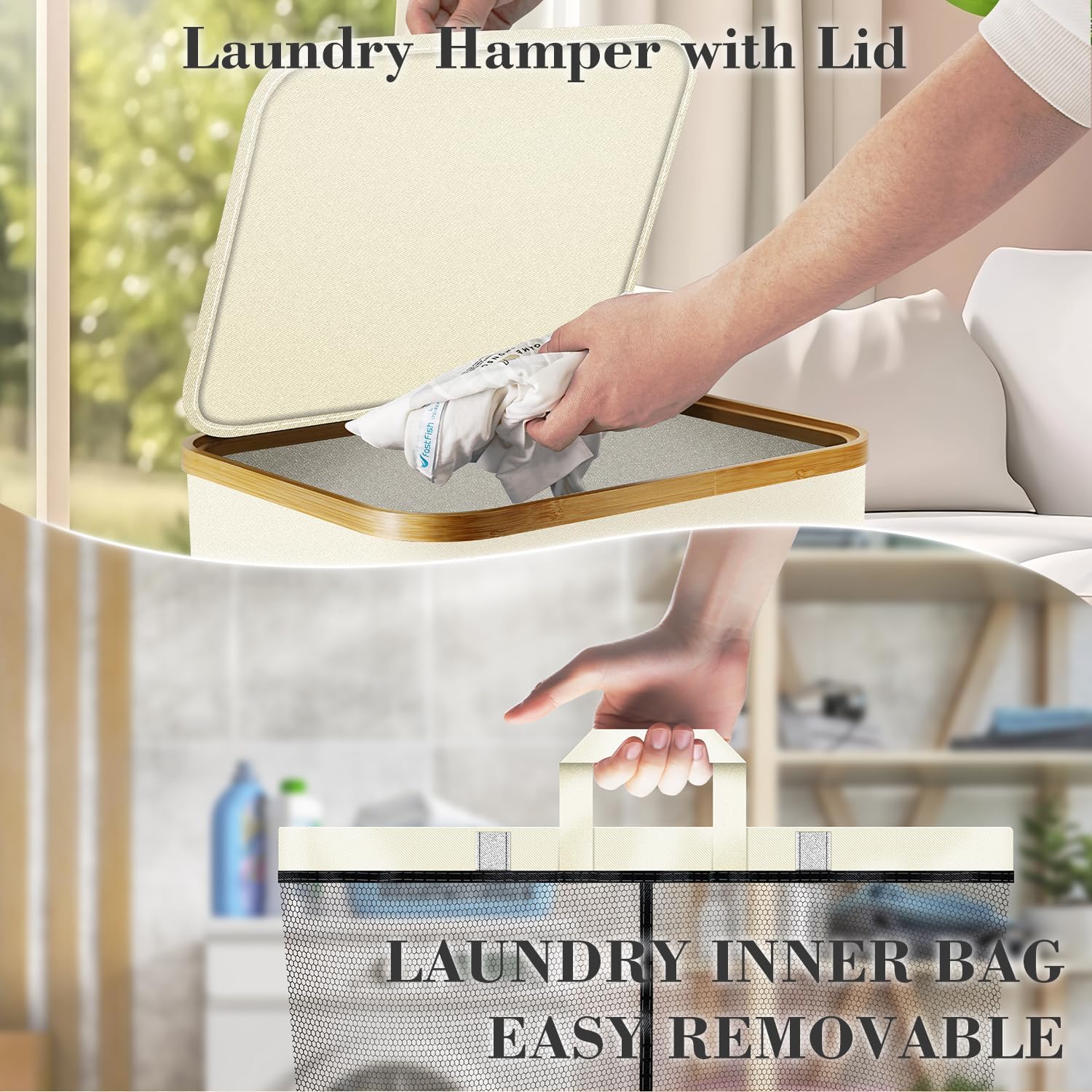 Laundry Hamper with Wheels,20 Gal (75L) Laundry Basket with lid Rolling Clothes Hamper Foldable Dirty Clothes Basket on wheels with Bamboo Frame and Bag for Bedroom, Dorm, Laundry Room-Off White
