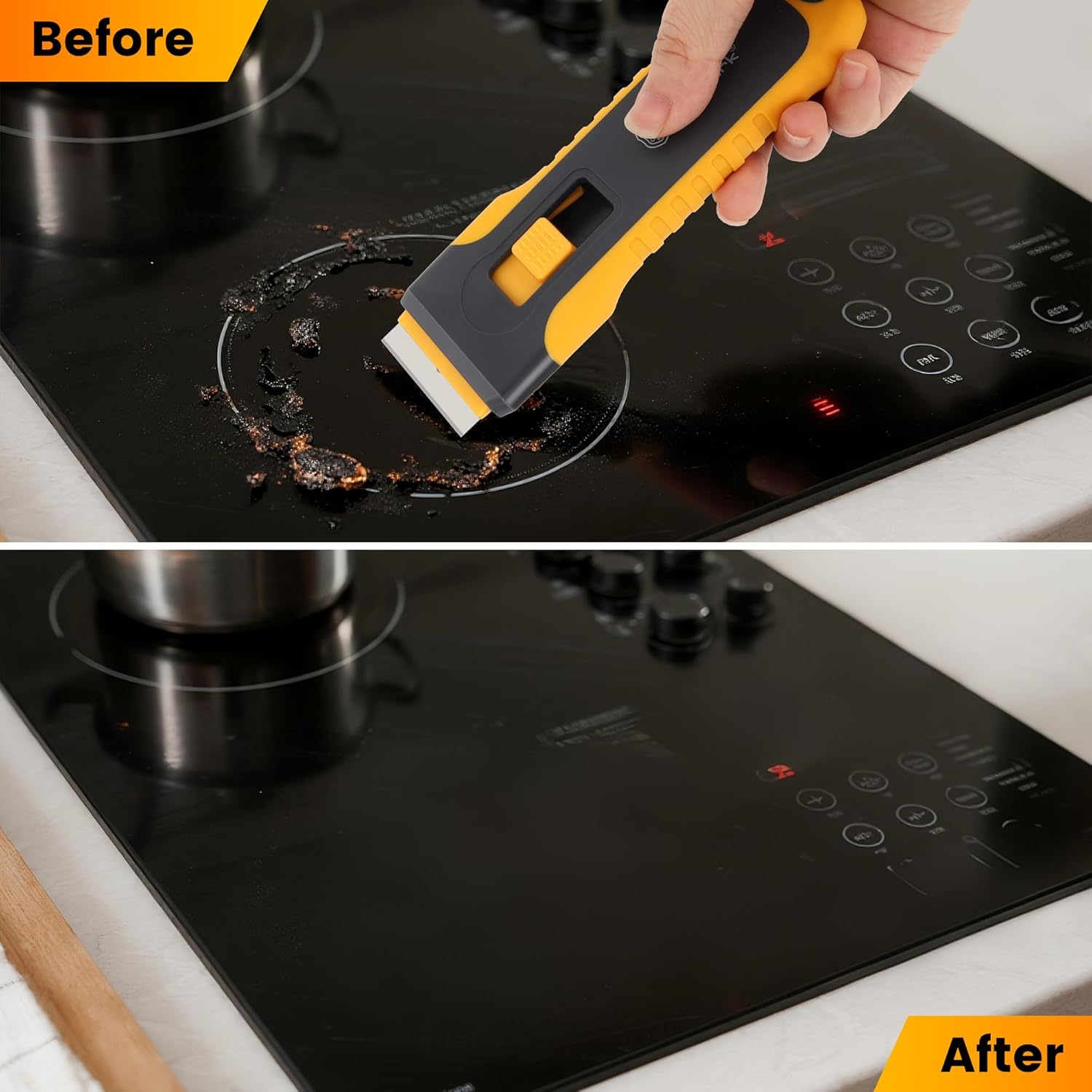 - 【 Multi-Purpose Scraping Tool 】Our glass stove top scraper is expertly engineered to eliminate burnt-on grease and stubborn residues from glass stovetops, ceramic cooktops, and induction surfaces without causing scratches. The versatile blade effortlessly adapts to a wide range of surfaces—including bathroom tiles, painted walls, windows, and sticky label removal—making it the ultimate all-in-one tool for every cleaning challenge.