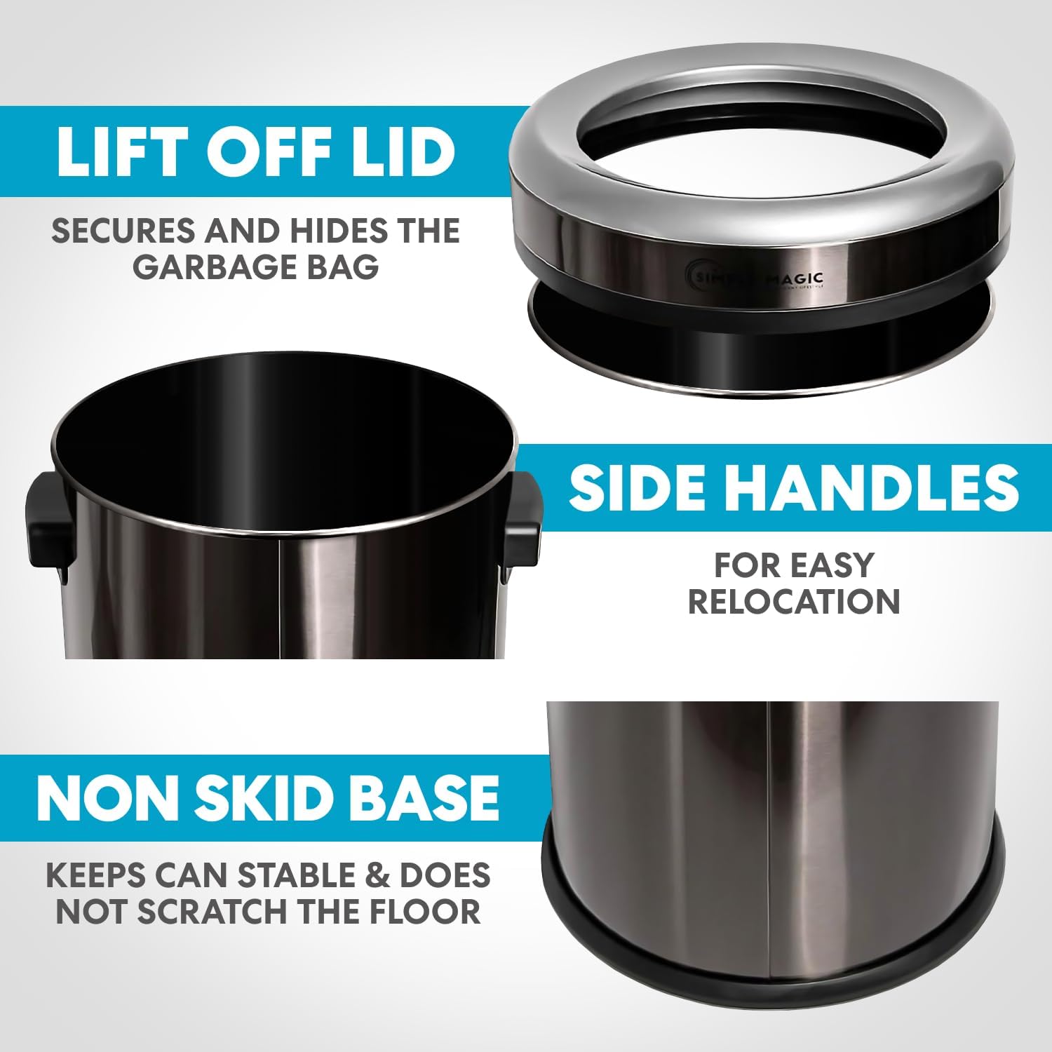- QUICK & EASY DISPOSAL โ Open Top design is perfect for Commercial Spaces and Busy homes: Restaurants, Restrooms, Offices, Lobbies, Stores โ Quick & Easy Trash Disposal