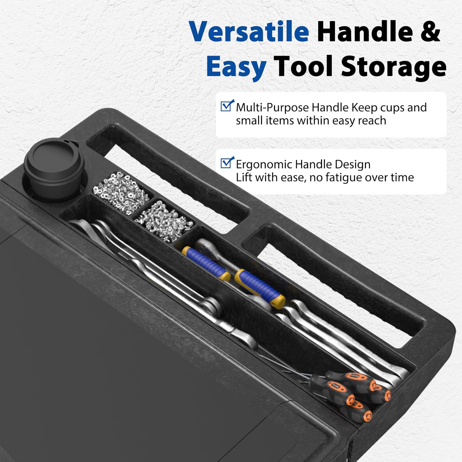- 【Ergonomic Multifunctional Handle】 Dual handles designed for comfort and reduced fatigue, with a central storage space for cups, tools, or small parts. Perfect for keeping essentials within reach when using this work cart on wheels or rolling tool cart.