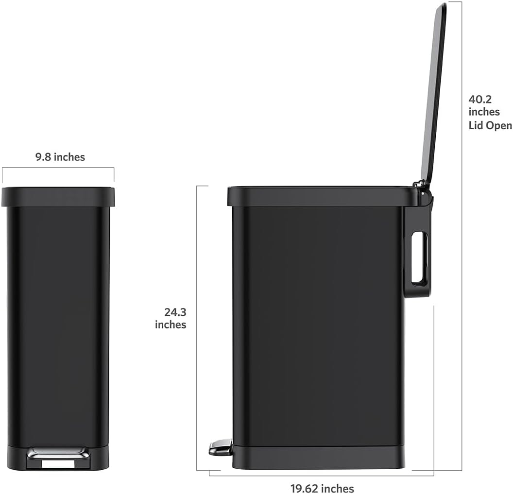 - STEP TRASH CAN WITH SOFT CLOSE LID: Lidded kitchen trash can is built with an easy step foot pedal for hands-free use. Garbage can lid is specially designed for a quiet, controlled open and close every time.